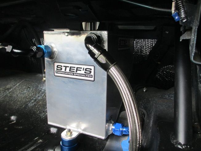 The tanks are very well made and engineered correctly with special internal baffles and plates designed to deaerate the oil. A.C. Nutter (my engine builder) helped me to size the tank. He has lots of experience with dry sump systems and he said to use a 3 to 4 gallon tank minimum if it's mounted in the trunk. The advantage to running larger tanks is that the oil has more time to deareate before getting pumped back into the engine. I have had good results with this set up. I installed a 4 stage dry sump pump, plumbing, and tank set up in the car last August and have run the car on the street since then, and one HPDE track day last September with no oiling problems. My oil pressure is about 40 psi at idle and 60 psi when cruising. Here are some pics of the set up http://i1048.photobucket.com/albums/...ps757b3109.jpg http://i1048.photobucket.com/albums/...ps01470492.jpg http://i1048.photobucket.com/albums/...ps97af8e0f.jpg http://i1048.photobucket.com/albums/...ps146acf3d.jpg http://i1048.photobucket.com/albums/...ps14570e95.jpg About $140 worth of oil for one oil change! http://i1048.photobucket.com/albums/...ps152ce2cf.jpg I'll post more on the whole set up later... I just wanted to get you the info on the tank. Here is the link to their website... I worked with Stan: http://www.stefsperformance.net/stef...cts/sump-tanks I started with tank #4155 under "custom dry sump tank assemblies". Stef'sdoes the custom tanks all the time... very good guys to work with. I decide to mount the tank in the trunk so I could keep things cleaner looking under the hood and I wanted to keep the battery, ECM, and fuel pump controller up in the right front of the car for easy access and better cooling. |