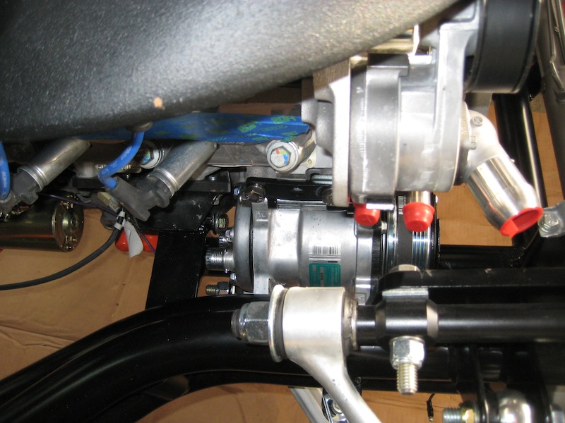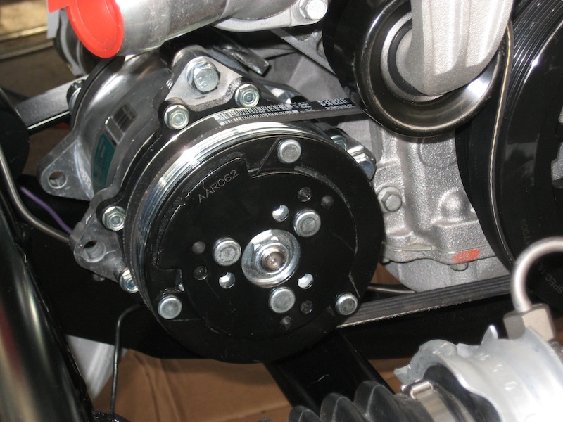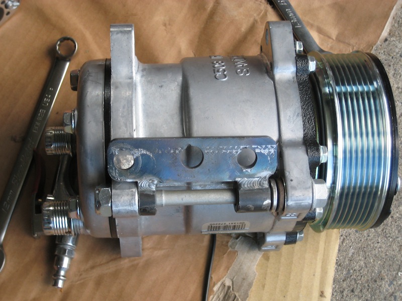custom bracket made for attachment of AC compressor so that it can be placed in stock location for better look.