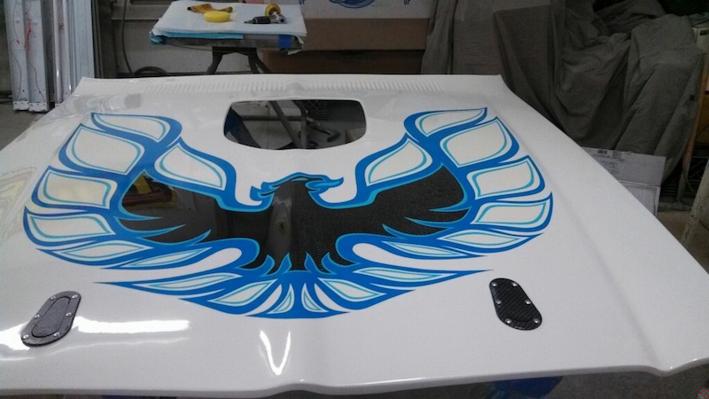 The carbon fiber hood looks terrific with a fresh coat of cameo white and new decals. The OEM decal is black in the center however the center of the bird was cut out for a unique carbon look on the trans am hood. The shaker is also carbon fiber.