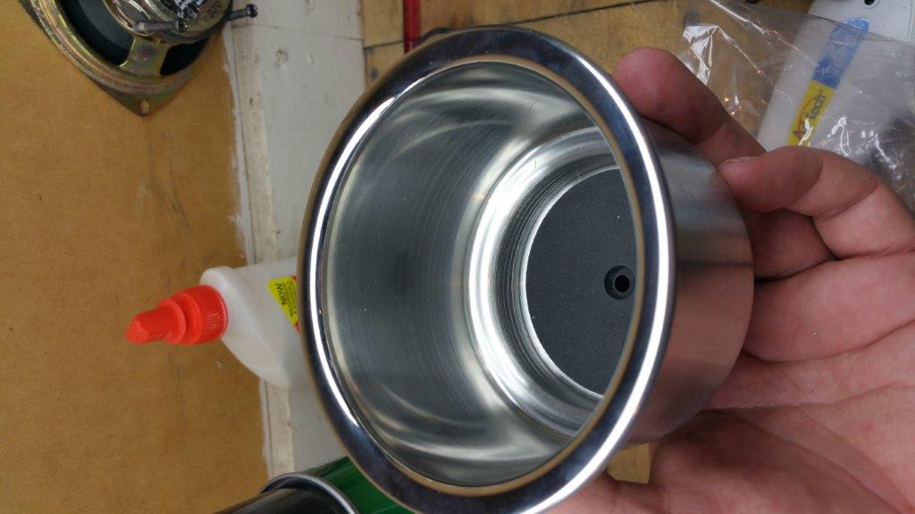 http://www.boatoutfitters.com/3-5-st...eel-cup-holder These also come with a self adhesive foam sealing strip attached to the flange. The nipple on the bottom is a plastic screw on compression fitting for connecting a drain hose (meant for a boat....so). You can just saw it off if you don't like it. I'm going to use the hole to bolt down the console and cup holder at the same time. |