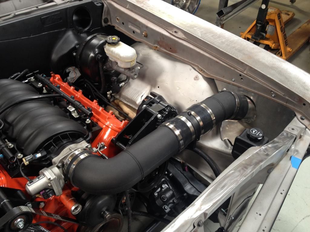 fuel tank in and plumbing is buttoned up.... brake lines are fitted...... radiator mounted and air intake system going together. Chris wanted a set up that matched the intake. The Airaid u-build it intake tube is a perfect match. |