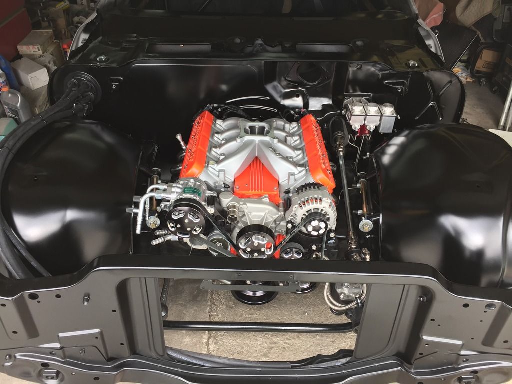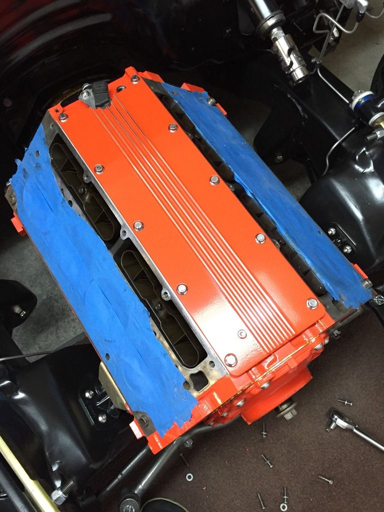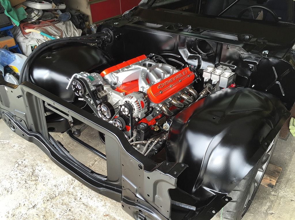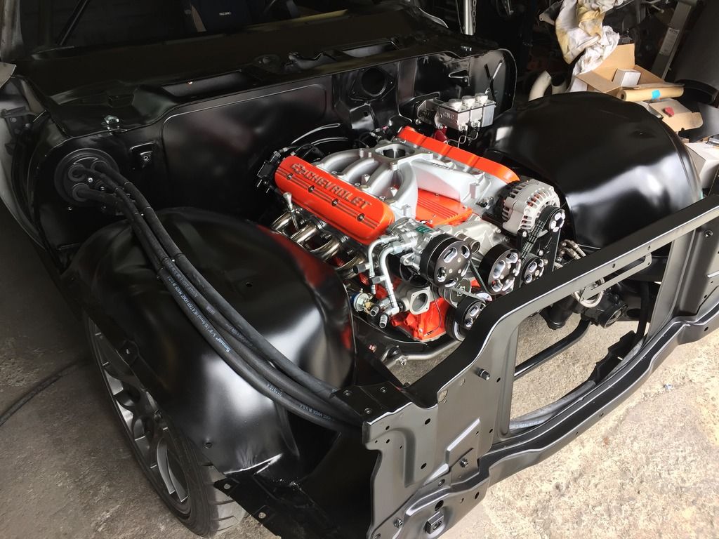 Well I got the motor and transmission installed. Being that I am going carbureted I did not like the look of the stock valley cover. I really like the look of the billet specialties ribbed one but they do not make them for the ls1/ls6 style valley only for the ls2/ls3 so I had to modify it to make it work. Also I got the brake lines all bent up. I also started making the door panel cards and package tray made so I can take them to get them upholstered without having to take the car while it gets painted. Now I am just waiting on getting my cylinder heads back so I can get them torqued down and assemble the rest of the car to go to paint.