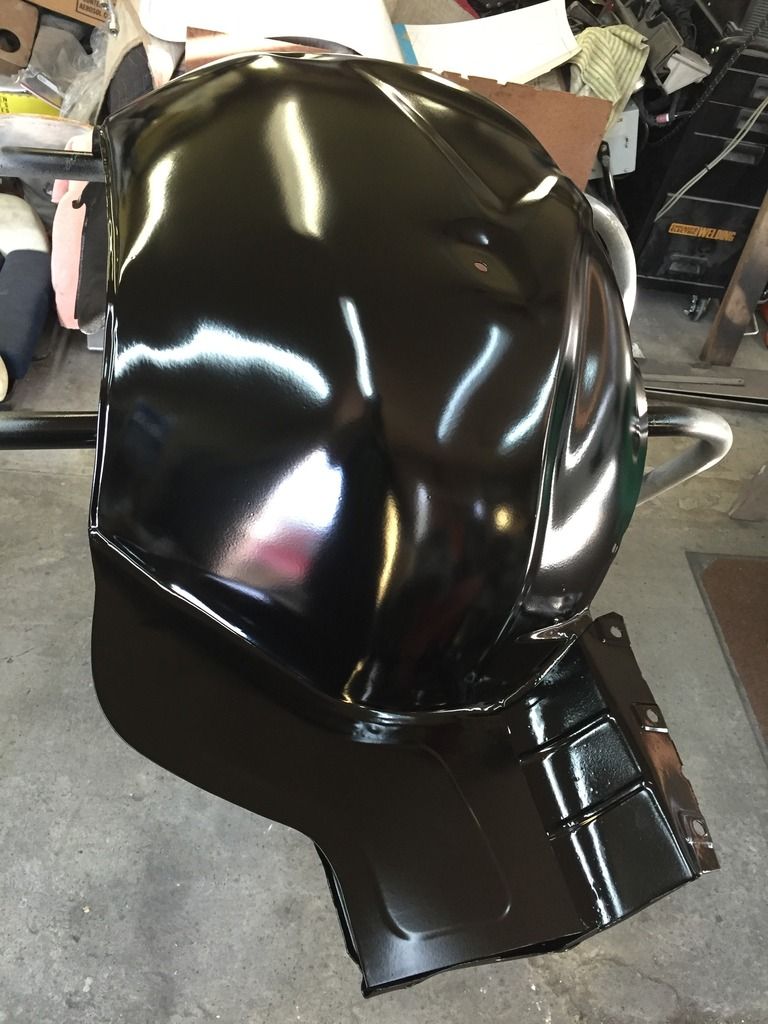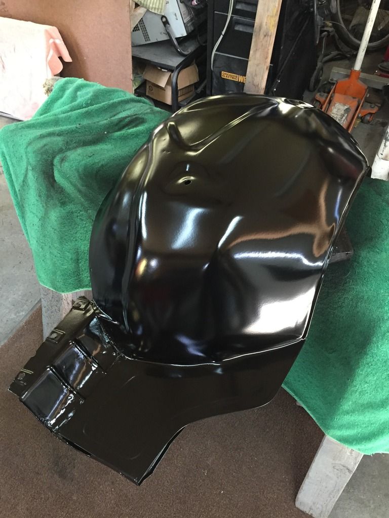 Its been awhile since I posted been getting a bunch of the little things done before it goes to paint. Got the cylinder heads back and installed also did the trunion upgrade. Got the inner fenderwells painted and also the radiator support. Got the design all done on the door panels so now all I have to do is get them covered. Now I'm just finishing up a couple of things and it can go off to get painted.