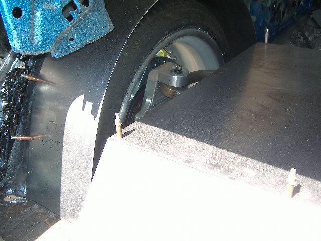 Also, we got the rear brake rotors on to double check and adjust the track width to make sure the tubs fit correctly. Also, the pic of the wheel is the not the ride height. We lowered the suspension travel down to it's lowest point in order to build the arch of the tubs.