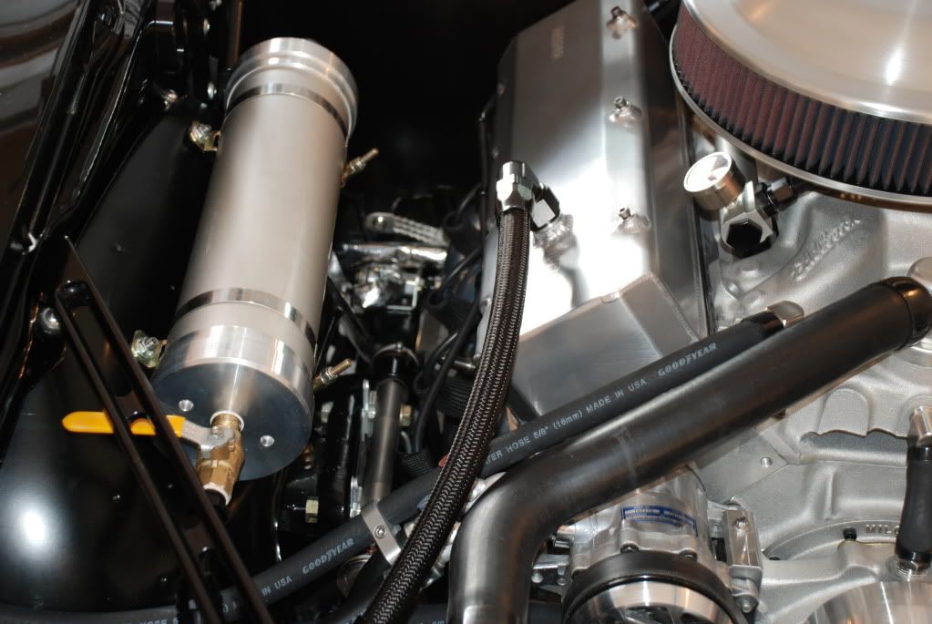It's in the corner of this photo. If I had it to do over again:D it would be under the car near the passenger foot panel. I used two 180 and one 45 fitting to make it work. At the time I wanted it as close to the carb but not mounted on the inner fender. :unibrow: It works great but it wasn't fun making it work with fittings. Seems easy now......