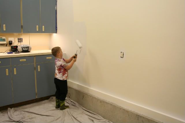 The ceiling is finally finished in flat white paint. I put the first coat of wall finish on today...actually just finished that! It will take one more tomorrow. It's a nice canvas color. It's kinda hard to see the differance between the walls and the ceilings...but they are a differant color.