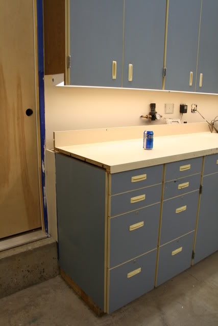 http://i235.photobucket.com/albums/e...e/IMG_2837.jpg And a couple shots of the close out panels I built on either end of the base cabinets. I still need to build a new bench top. My plan is for it to go over the close out panels and not use a back splash...I just want a nice big area to work on since I gave up quite a bit of counter top in order to make the space more Karma friendly! :lol: Also I need to pour and concrete step where I cut the new door in. http://i235.photobucket.com/albums/e...e/IMG_2848.jpg Note the task lighting....and air regulator for the big air compressor that's out in the store room! ;) http://i235.photobucket.com/albums/e...e/IMG_2849.jpg |