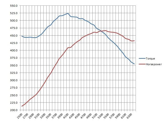 To me, this is why we put it on the dyno. Not to see what the peak number was but to see the curves and where the peaks were (and mostly just to break it in and make sure there were no issues). Every dyno is different and especially when corrected for conditions...who knows what the real number is. On a different dyno on a different day, I'm sure the numbers could be 30 or 40 off of this in either direction. For this dyno...and the conditions present at the time, this is what it made. http://img.photobucket.com/albums/v3...ps59czf0uf.jpg 524 ft lb at 4100 RPM and 467 HP at 5400 RPM. That was the last pull with the air cleaner and spacer on. It was about 5 hp higher throughout than the 2nd pull (first with air cleaner on). Here is the first pull without the air cleaner on. http://img.photobucket.com/albums/v3...psrasacqpu.jpg As you can see it made 50 ft lbs and 22 HP more at peak with the air cleaner and spacer installed!! I am VERY happy with the results...ecstatic even. I can't wait to see what the butt dyno feels like. I'm slightly concerned that I may now have a more serious traction issue. :D |