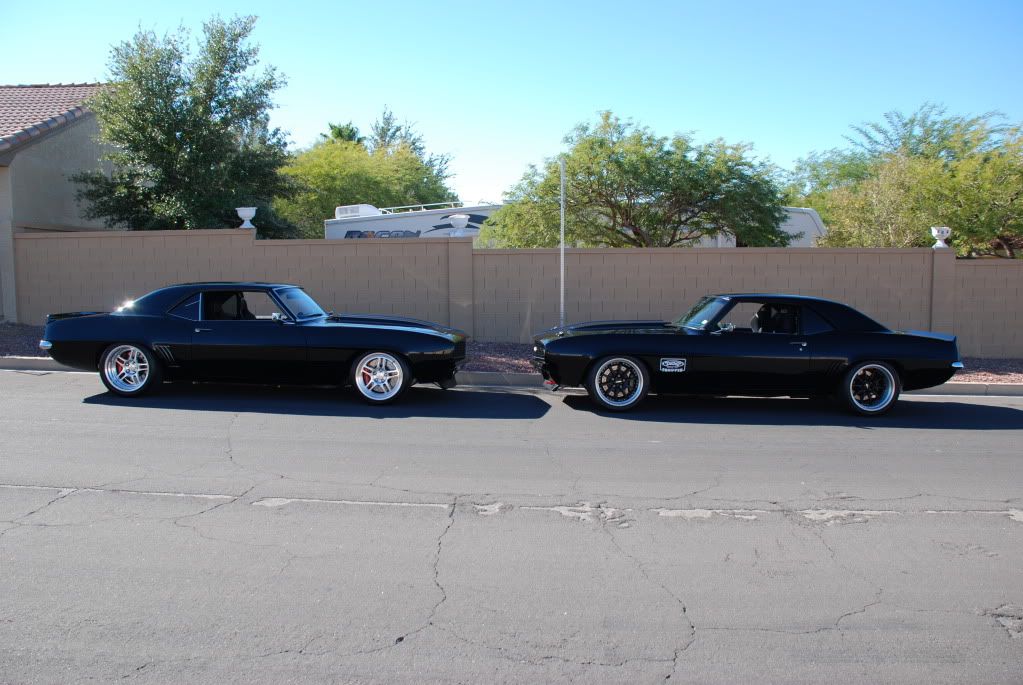 --Changed/inspected oil a 2nd time since distributor gear broke last weekend. This oil looked and the oil filter was cut open and looked great as well. Bronze gear doing it's job so far. Will check again either in Bakersfield or in Irvine after a few hundred miles of wear. --Wilwood e-brake kit installed --Played with prop valve and dialed in maximum rear brake bias and still could not achieve rear brake lockup. May not have optimum MC bore. Looking into that now, but brakes are much improved as expected over previous disc/drum setup. --Car was stalling when stomping on brakes. Adjusted various carb settings. After the last of the street testing runs on a sparse commercial road, a few cops starting heading to the area. I'm sure I had nothing to do with it. :_paranoid But, one of the worst things I could have done for that day was ride shotgun in Rich's flagship build car (for his buddy/customer Eric David). It's very similar to Todd's 69 in a lot of ways, and it ruined me for the day. What a beast and beautiful car (Eric's on left, Todd's on right for those that just registered yesterday). We are working on convincing him to come to RTTC with us. :thumbsup: http://i236.photobucket.com/albums/f.../SEMA10001.jpg |
