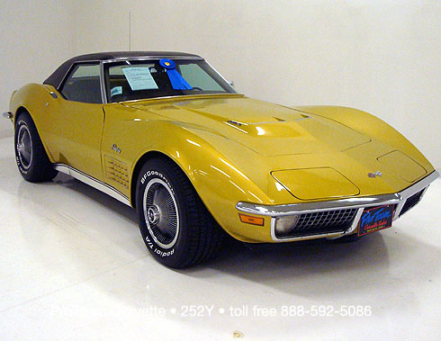 Steve, Just as an FYI, One thing I've noticed in checking out this particular GM color on a bunch of corvettes is that it typically looks quite different than the pic you posted; Take a look at the color on this War Bonnet Yellow LS5, 1971 Survivor car (Original Paint). The color is more of a "lemony" yellow, whereas the pic you posted is more of a "caramel" yellow...I remember having a banana-seat bike (I think it was a Ross Apollo) in this color! LOL http://proteamcorvette.com/cars/photos/252Y.jpg |