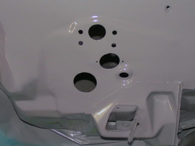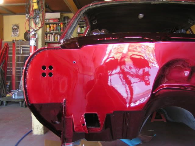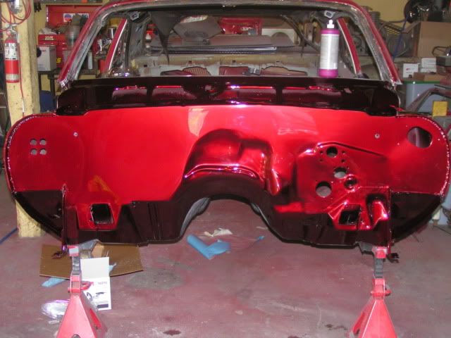 Well I finally got the firewall painted. Overall I'm happy with the way it turned out considering I did it in my garage. There are a few dust specs and a couple places where a dark spot of red came out, but it is only the firewall and when the motor and everything is in there, it will be barely noticeable. Unfortunately I ended up with a few runs at some of the holes in the firewall. I didn't mask them from the inside and ended up with runs. Not sure if I'm going to bother fixing them or not as the fenders will cover them up and will never be seen by the public's eye.