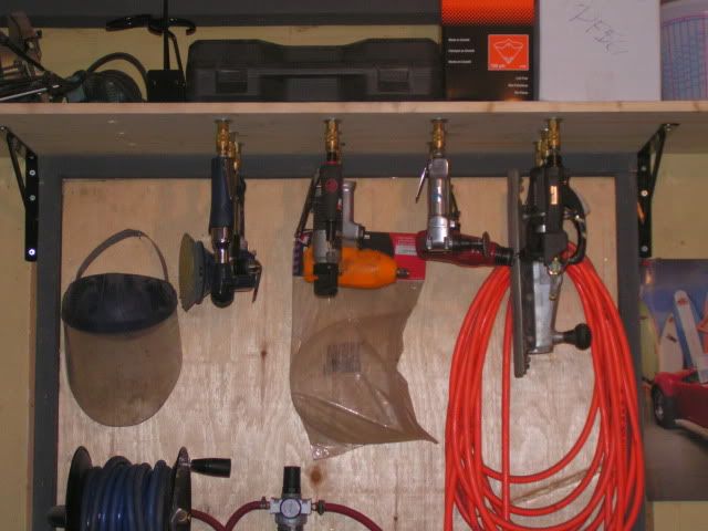 Well I decided to atleast put the rear wheels on today. I had to take the rear brakes apart though as I had the rotors on backwards. I'm getting pretty good at installing the safety wire :D I hope to have the fronts on next week as I go into my 4 work days starting tomorrow. Before I got to the wheels, I spent a bit more time reorganizing the shop. I've put in a few shelving units to make more room. If any of you have ever wondered what you could do with your air tools, here's what I did with mine. I had them under a cupboard before, but the cupboard went to the dump so I made a new shelf. The initial cost isn't cheap as all the female air ends are not cheap. I plan on adding 3 more still for a total of 15. http://i222.photobucket.com/albums/d.../PICT00384.jpg So now with the 305's, I still have about 2" clearance inside. I think once I wear these tires down, I'm going to send the wheels away to be widened (I can get them done for $150 each where a lot of the wheel companies want $400 each) and look at some even wider tires. Now that I have the wheels on the car, I'm really happy with the way they look. Here's some pics: http://i222.photobucket.com/albums/d.../PICT00505.jpg http://i222.photobucket.com/albums/d.../PICT00436.jpg http://i222.photobucket.com/albums/d.../PICT00446.jpg http://i222.photobucket.com/albums/d.../PICT00455.jpg |