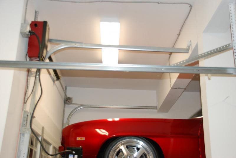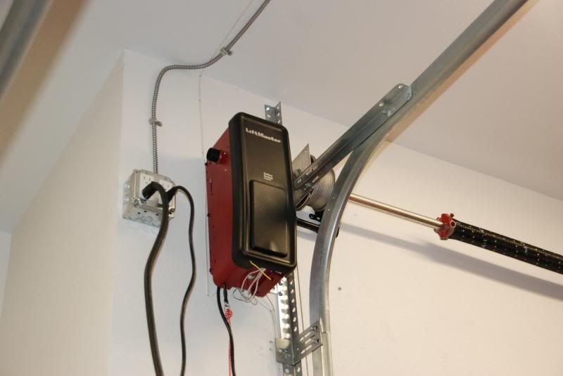 The garage door I removed the standard motor and low hanging tracks, installed a liftmaster wall mounted motor and spring, and re-routed the tracks up higher to the ceiling. My buddy is on garage journal steady and gave me the idea. The door does not open fully, but it opens about 90%. (The bottom of the door hangs down from the opening about 12") But theres more than enough room to drive a car in. Maybe even an SUV. http://i34.photobucket.com/albums/d1...ps0d38f4b3.jpg http://i34.photobucket.com/albums/d1...ps33e05aad.jpg |