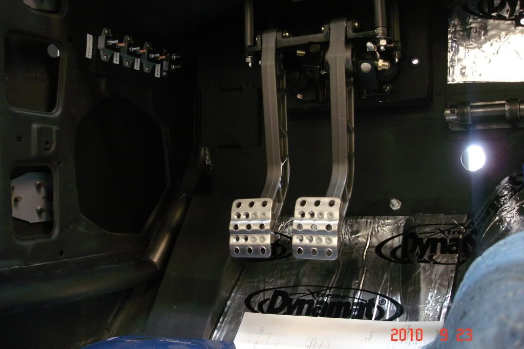 They're new Wilwood units. They are mounted to the firewall, but they are also made to hang as well, I believe. Steve made a dead pedal to match. |