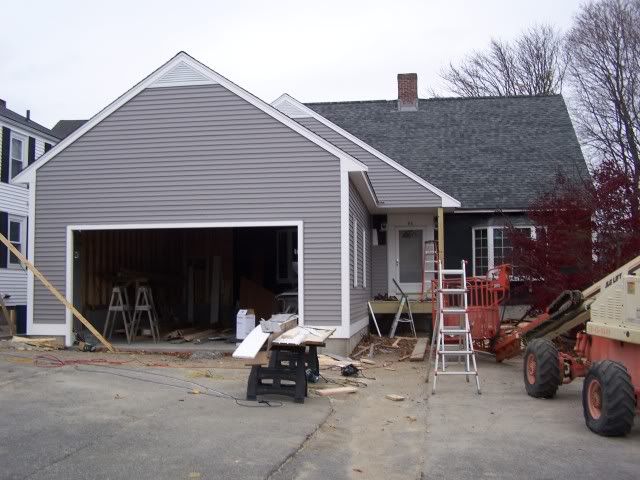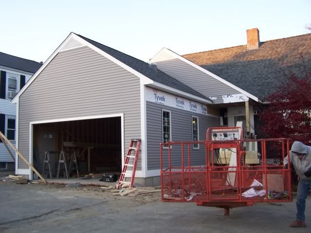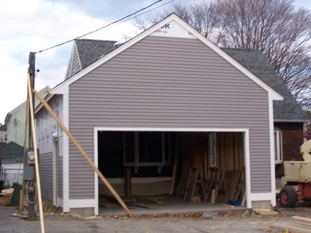 They finnished all the vinyl on front of the house. They just need to finnish the trim on the bottom of the window, the stairs and rails and the front is done. They had some vinyl to do on the back wall that got done too. They have a small section to tie into the house with red cedar shingles and the outside is done. I called a guy to install the garage door. Waiting to hear back from him with a price onthe install and the high lift track set up.