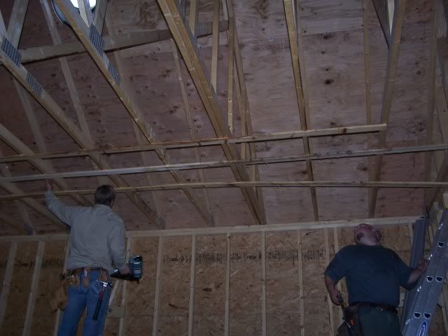 Got a little progress today. They strapped the trusses to keep them straight untill I put the sheetrock in later on. They also did some of the vinyl on the front of the garage. They stopped short of the top because I have a gable end vent for the two peaks ordered . They are suposed to be here Monday morning.
