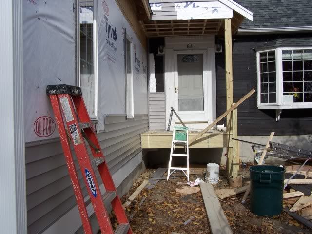 They finnished the stairs and hand rails on the porch They still have some trim under the bay window to finnish and the white boards under the threshold, then that side is done. Monday they will remove the window in the garage and put in the door to replace it.