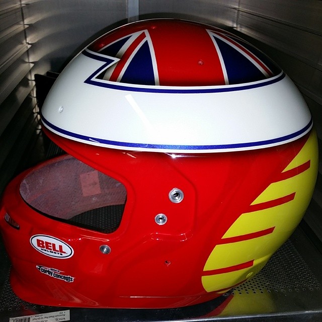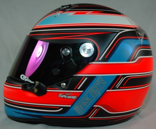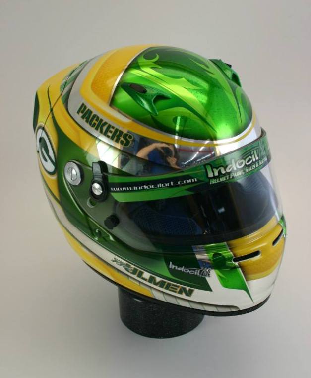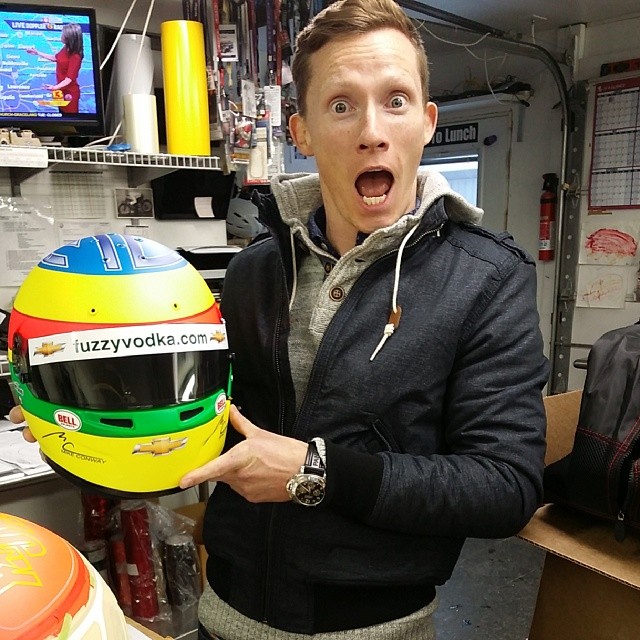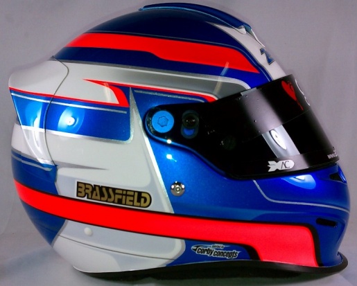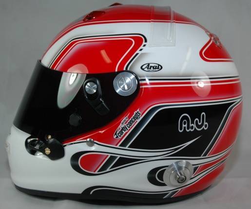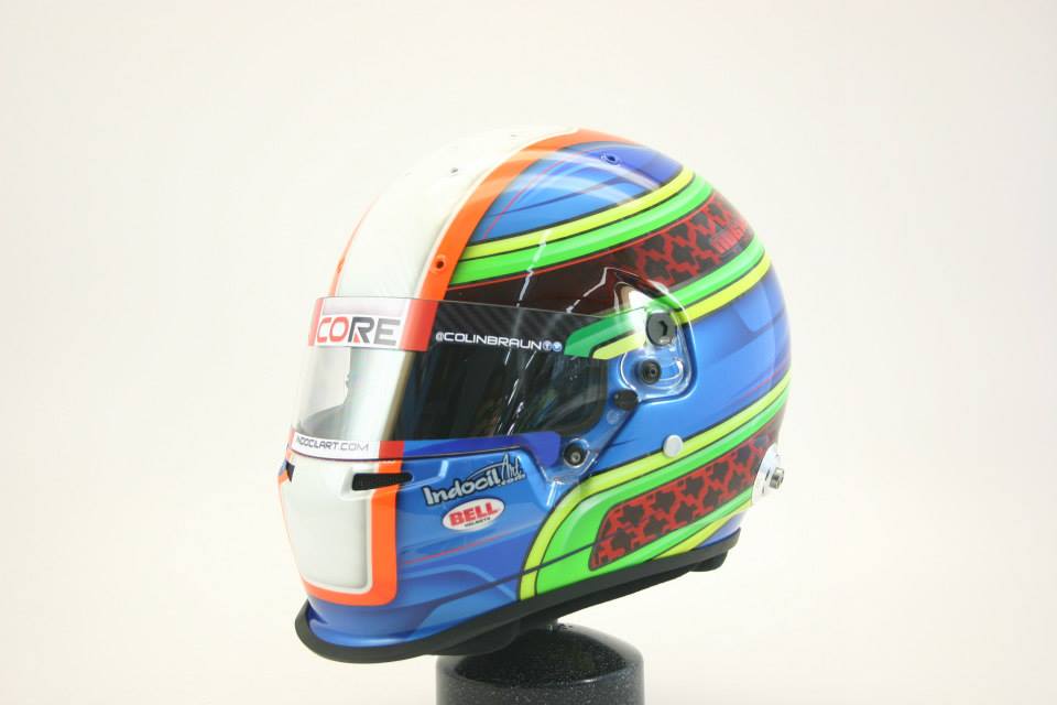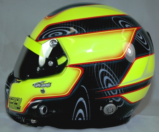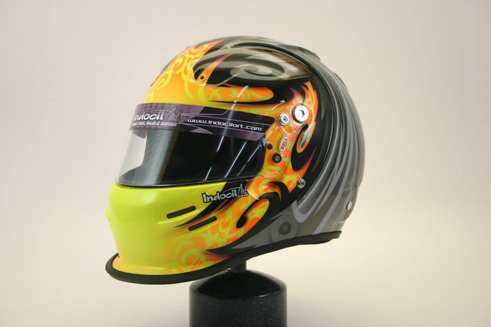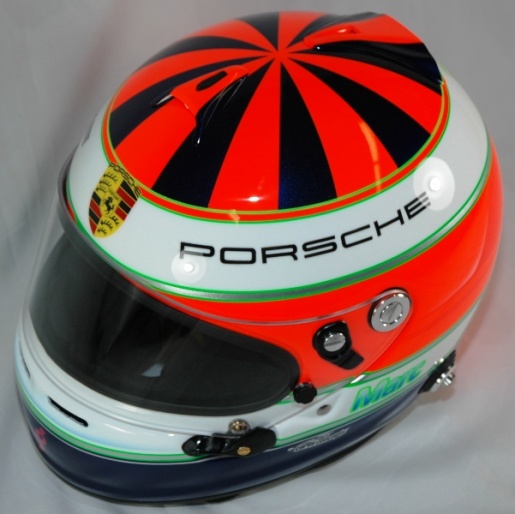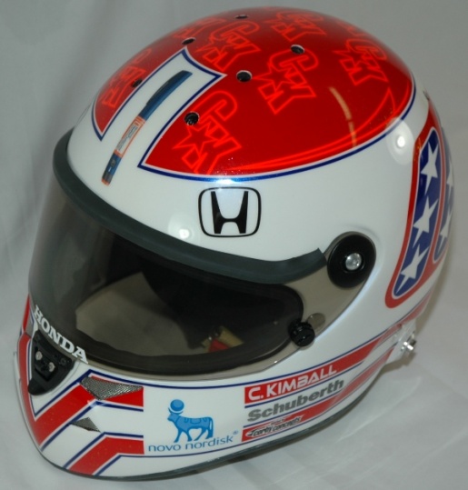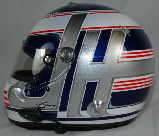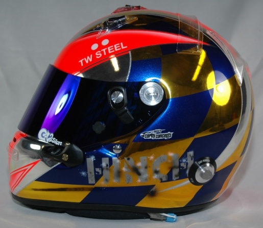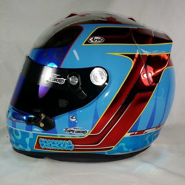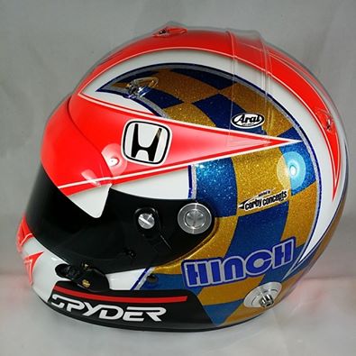 Another helmet of James Hinchcliff, IndyCar. It was only worn last weekend during the Grand Prix of Indianapolis. He was hit in the Helmet by a piece of Carbon Fiber debris which gave him a Concussion. Anytime an IndyCar (and most other Series) Driver is involved in an accident, the Helmet is deem unsafe by the Officials and cannot be worn again.