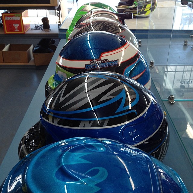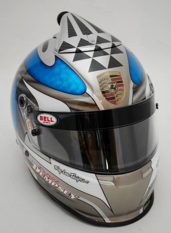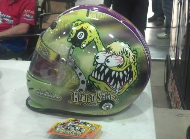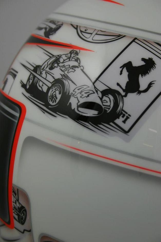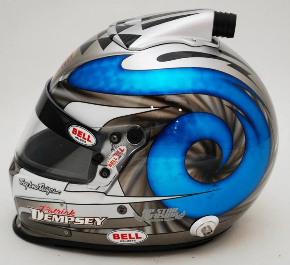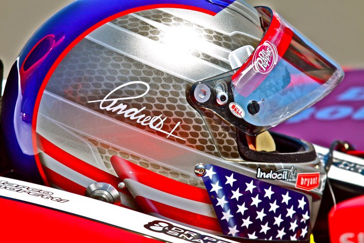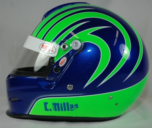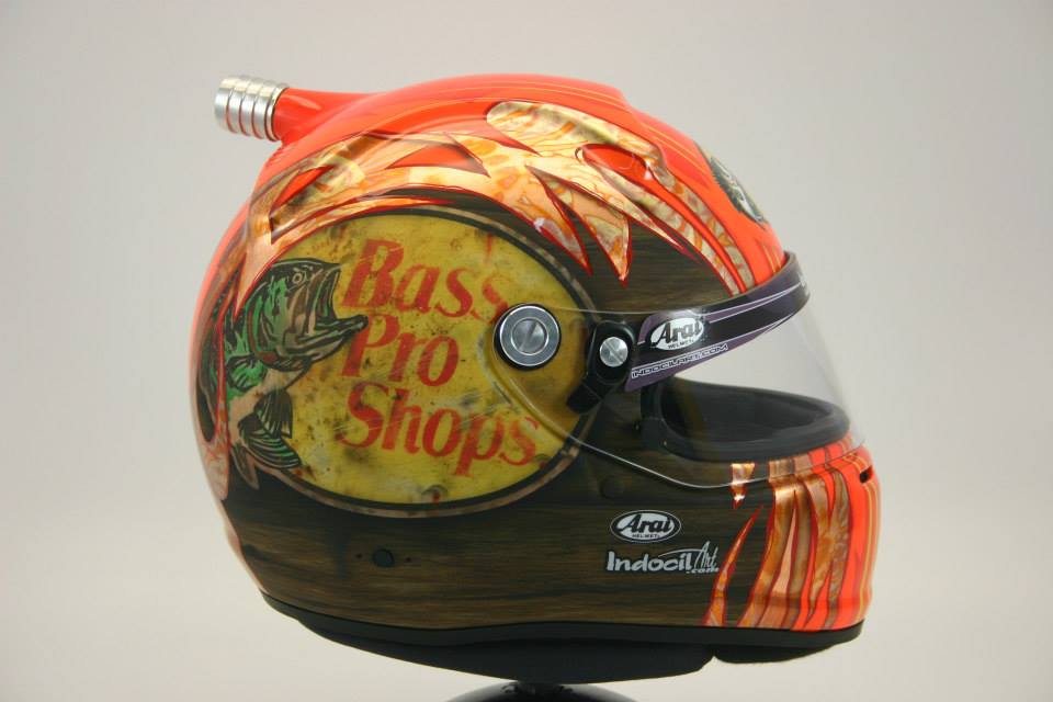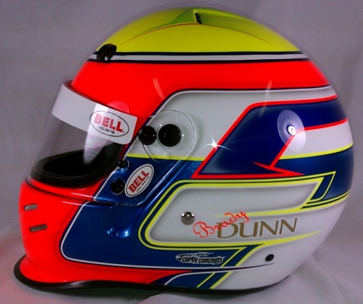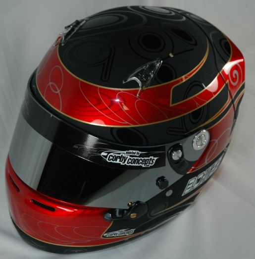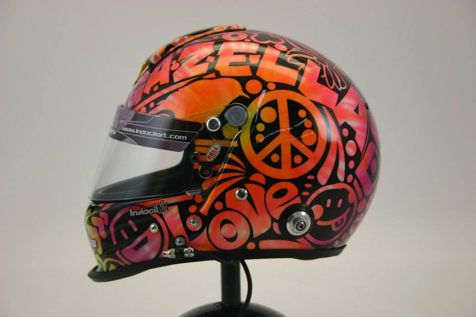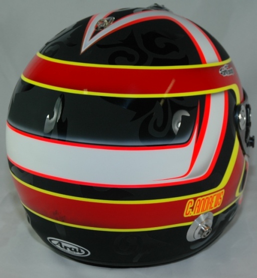 Another helmet of James Hinchcliff, IndyCar. It was only worn last weekend during the Grand Prix of Indianapolis. He was hit in the Helmet by a piece of Carbon Fiber debris which gave him a Concussion. Anytime an IndyCar (and most other Series) Driver is involved in an accident, the Helmet is deem unsafe by the Officials and cannot be worn again.