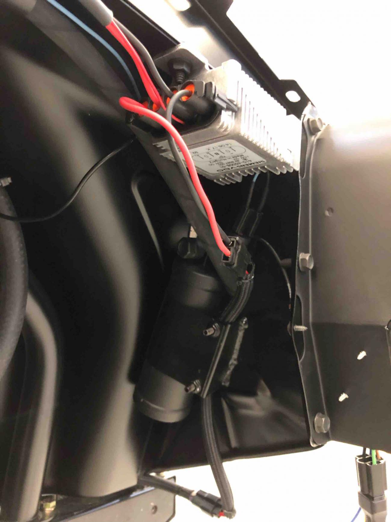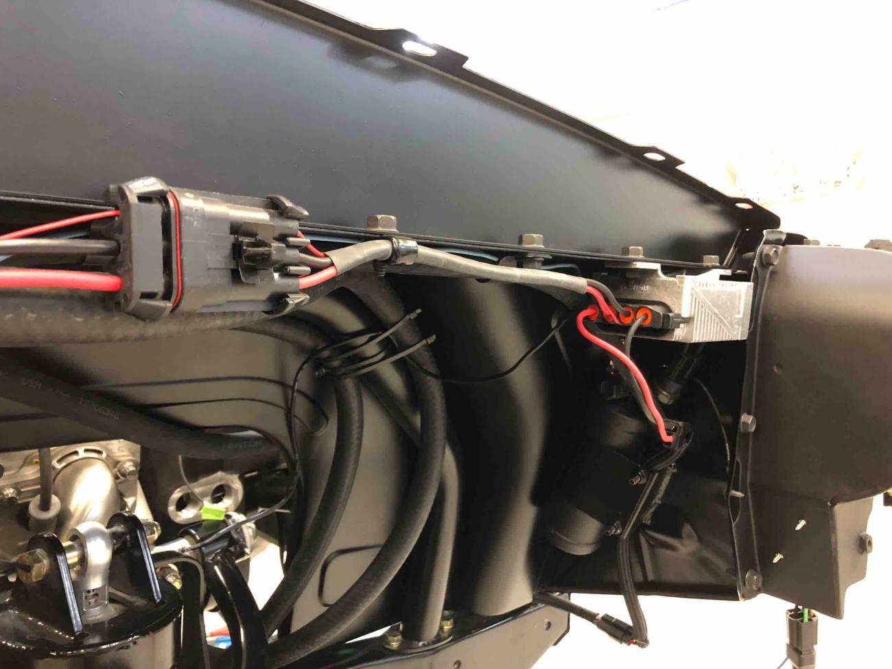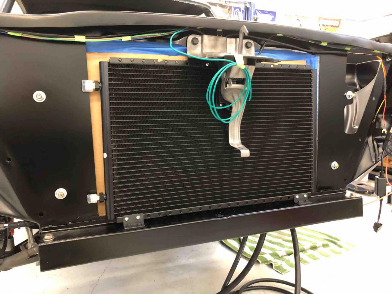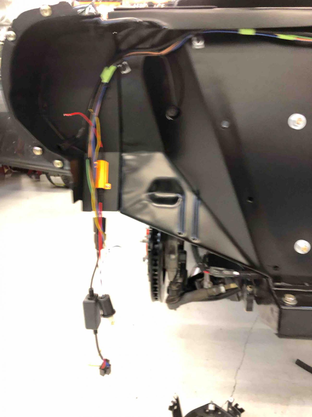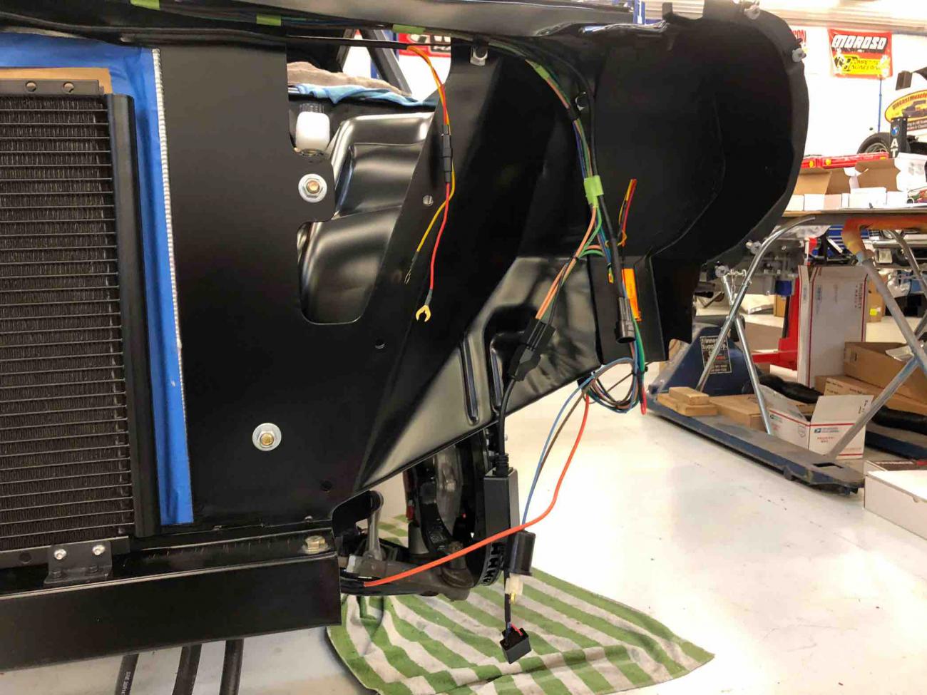 Attachment 73044 Attachment 73045 The pulse width modulation fan control module is also mounted under the passenger inner fender well, as is the A/C drier. The output from the PWM fan control module is wired into a really slick Spal harness that splits the single set of output wires to the fan into two sets of outputs to feed each of the Spal fans, all using Spal wiring connectors. The dual wiring harness is fed through the inner fender well at the base of the radiator and plugs into the fans along the bottom of the radiator - barely visible in the engine compartment. Attachment 73046 Attachment 73047 Wiring is all ready to go for headlights, parking lights, etc. The headlights are LED with halos. The halos function as daytime running lights and are white, except when you use the turn signals, when the halos flash amber with the turn signals. A little tricky to figure out the wiring as the instructions weren’t very good, but we got it figured out. Attachment 73048 Attachment 73049 The A/C condenser is mounted nicely and A/C lines will be run discretely through core support. Once all of the A/C lines to the condenser, as well as oil cooler and power steering cooler hoses have been measured and fit to the radiator, we’ll pull the radiator and have it powder coated (except for the core itself). Hood latch still needs to be painted... Attachment 73050 Holley engine harness is connected, but hidden nicely under fuel rail covers. Engine bay is really clean. We need to powder coat the air intake, which isn’t shown here, but first need to weld in a bung for PCV connection. Attachment 73051 Attachment 73052 View from driver’s side inner fender well. Attachment 73053 Kurt was working on installation of Rick’s tank and VaporWorx PWM fuel control module as I was leaving. Hope to have that installed tomorrow. Great to see continued progress! Sent from my iPad using Tapatalk |