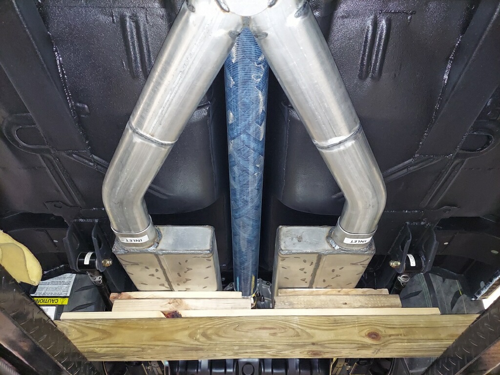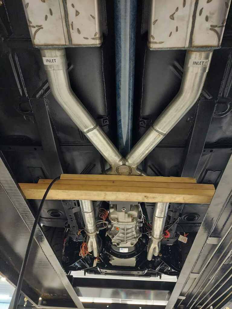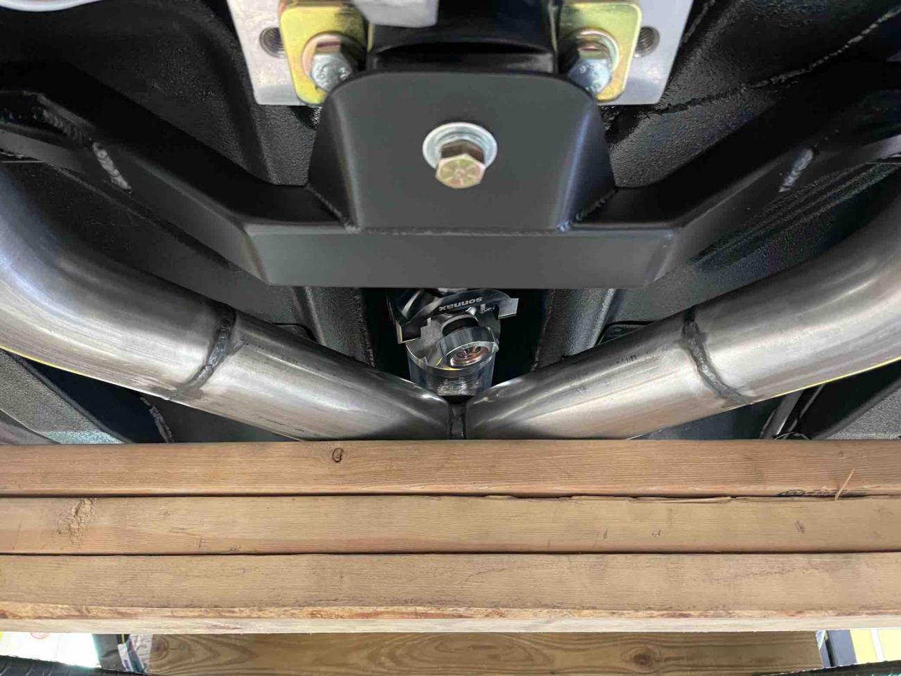 Stopped by the shop yesterday and was able to check out recent progress... exhaust is mostly complete, though I don’t like the way the tailpipes are routed, so we need to re-do those, which shouldn’t be a big deal. Here are some pictures I took of exhaust - I’m using 3 1/2” oval pipes (equivalent in flow to 3” round pipe) from headers through X-pipe to Spintech mufflers. The mufflers have oval inlets and round outlets, so easy transition to 3” round pipe from the muffler on back, since the round pipe is much easier to snake above rear suspension and around fuel tank.