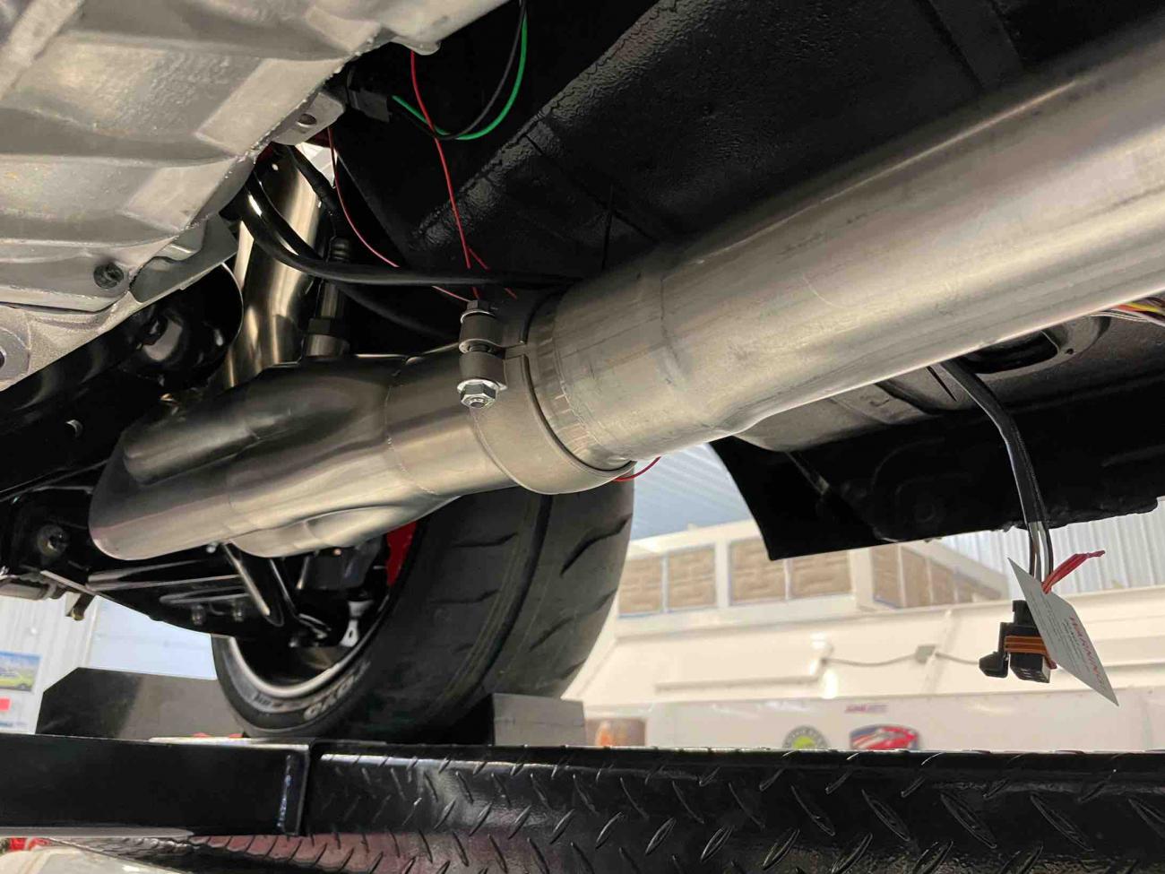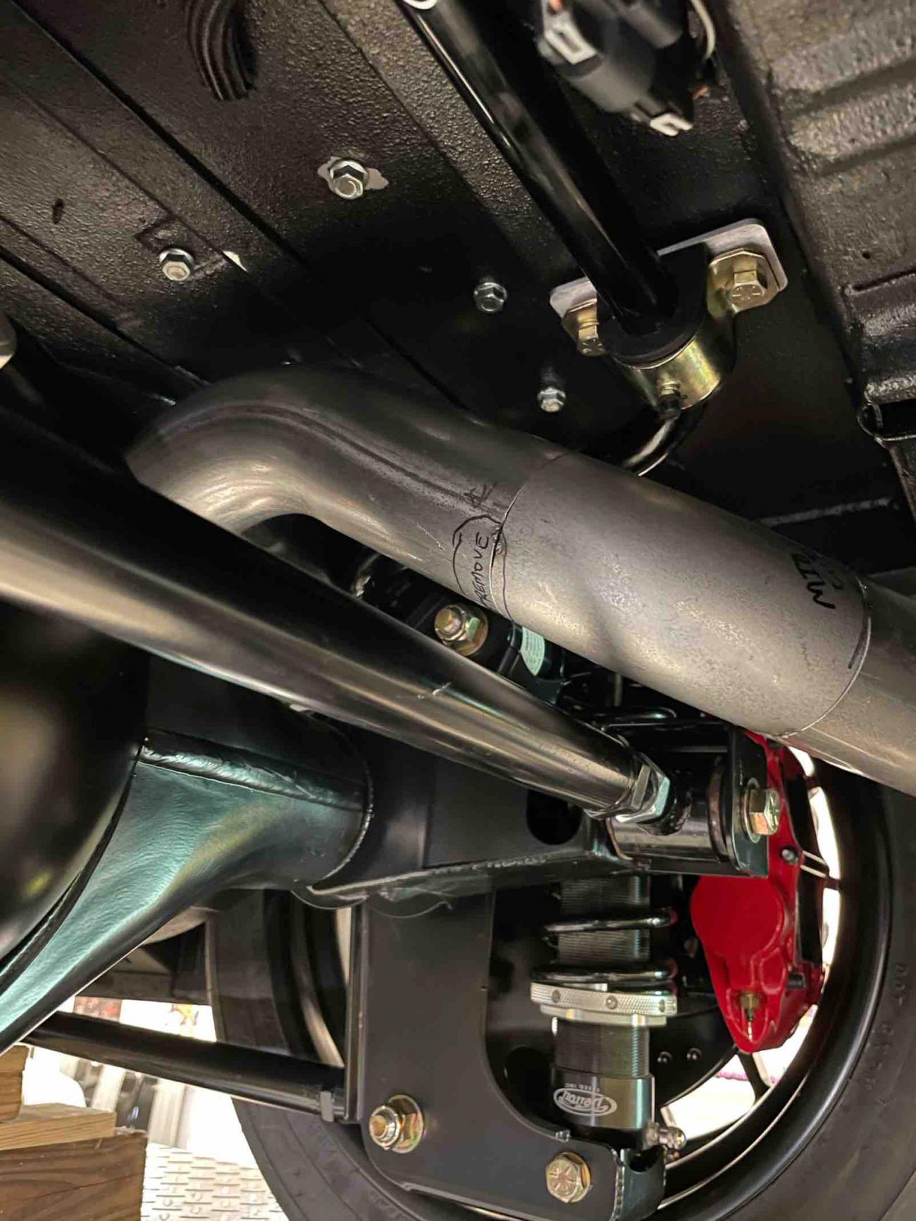 Attachment 73275 Attachment 73276 Attachment 73277 Kurt modified the transmission cross member slightly. The change kept the transmission mount height exactly where it was, but elevated the sides of the mount about an inch, which gave us another inch or so clearance to tuck the oval tubing closer to the floor. Attachment 73278 Attachment 73279 Attachment 73281 Transition from muffler to tailpipes are made with V-band clamps right off the muffler. Attachment 73280 From there, exhaust snakes up and over axle and QuadraLink, and around fuel tank. Attachment 73282 Attachment 73283 Attachment 73284 As I mentioned above, the tail pipes are tacked together and currently turn to the side and dump behind each rear wheel. I really don’t like this look, so we’re going to re-do this portion. https://uploads.tapatalk-cdn.com/202...64436a21b4.jpg https://uploads.tapatalk-cdn.com/202...2ad4ecda15.jpg https://uploads.tapatalk-cdn.com/202...4ff3556ab7.jpg https://uploads.tapatalk-cdn.com/202...7545c51a05.jpg https://uploads.tapatalk-cdn.com/202...4ac5bbd4a6.jpg There is plenty of space to turn the tailpipes up and run them inside the rear quarter panels, above the pinch weld, so they can’t be seen from the side of the car. Below are some photos of what I have in mind from a nice ‘67 Chevy II exhaust project detailed on Steve’s nova site forum. Pipes will turn down and exit toward the ground near corners of rear bumper with everything up above the bottom edge of the rear quarter panel. https://uploads.tapatalk-cdn.com/202...b4e47b178c.jpg https://uploads.tapatalk-cdn.com/202...51815e72c6.jpg Guys have most of the brake lines finished up in the rear and working on running them to the master cylinder. https://uploads.tapatalk-cdn.com/202...2f54789fe0.jpg https://uploads.tapatalk-cdn.com/202...800eb76a54.jpg https://uploads.tapatalk-cdn.com/202...8362f0ed0d.jpg Got a nice picture of the wiring and plumbing for the Vaporworx PWM fuel pump controller while I was crawling around under the car :) https://uploads.tapatalk-cdn.com/202...a457d1bd99.jpg https://uploads.tapatalk-cdn.com/202...08272371be.jpg For fuel line, I ordered some carbon lined PTFE hose from TechAFX, which is available in a cool, matte black finish. The finish is similar to regular black radiator hose and will match the hoses I’m using throughout the engine compartment (radiator hoses, push-lock hoses for catch can and PCV system, etc). Below shows the hose connected to fuel rail. https://uploads.tapatalk-cdn.com/202...a7d5d0bca2.jpg I have a fuel pressure gauge set up in my Holley digital dash, so I needed a sending unit plumbed into the system. Wanted to measure pressure as close to the fuel rail as possible, but keep it hidden. We were originally thinking we would plumb it under the car near firewall; however, we were able to plumb the port for the sensor right off of the fuel rail itself, and have the sending unit and related wiring all fit under the fuel rail cover so it is completely out of sight. https://uploads.tapatalk-cdn.com/202...8b5892fea8.jpg We’ll get the tailpipes redone this week and Kurt is also going to modify the hood latch for a remote hood release. We’re following a mod done by some others over on Steve’s nova site. The hood latch mechanism has two releases - first, it releases the hood lock and then as you pull the lever further, it releases the safety latch. You can modify the latch so the lever behind the grill only releases the safety latch. You then fab a bracket and have the hood lock operated by a cable mounted under the dash. That way, unless you’ve first released the hood lock via the cable in the car, the lever behind the grill doesn’t do anything when you pull on it. Take care, Brian Sent from my iPad using Tapatalk |