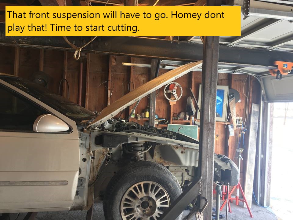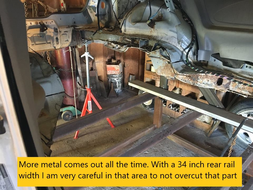 With the car set on the jig we need to get rid of a lot of “Cougar”. It saves weight for moving it around and it also helps my scrap metal pile grow. Can’t look like a true hillbilly without a large scrap pile can you?