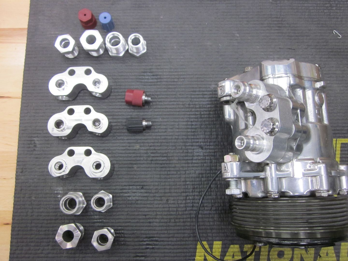 I got the A/C compressor adaptor block from my machinist today.. he made them out of stainless & aluminum.. options for which one will be easier to make.. Notice that the service port fittings are threaded to mount on top..
