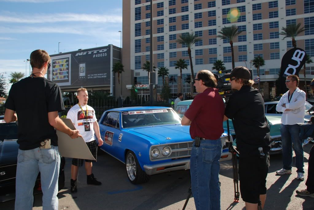 I had a great week with Sema and the Optima Challenge. Big thanks go out to Larry for the opportunity to represent Pro-Touring.com. It was a real honor. The event was run flawlessly by Jimi Day and his crew. The week started out on Monday when Carl and I cruised down to SEMA together and put our cars in the Optima Batteries corral. This event is supported by many great sponsors and I was happy to sticker up my car. In fact, I really like the way it looks in race mode. I had the first TV interview of my life. That was interesting to say the least.