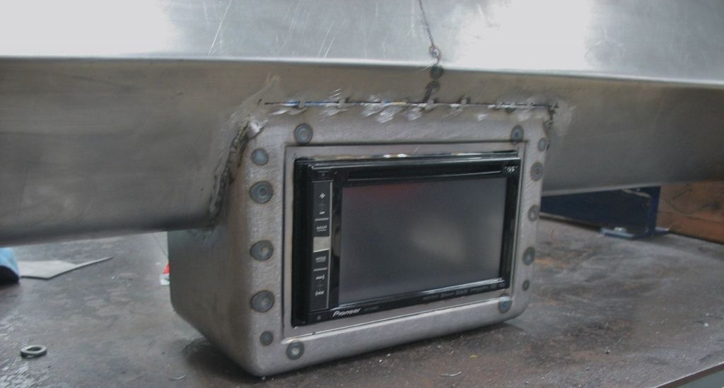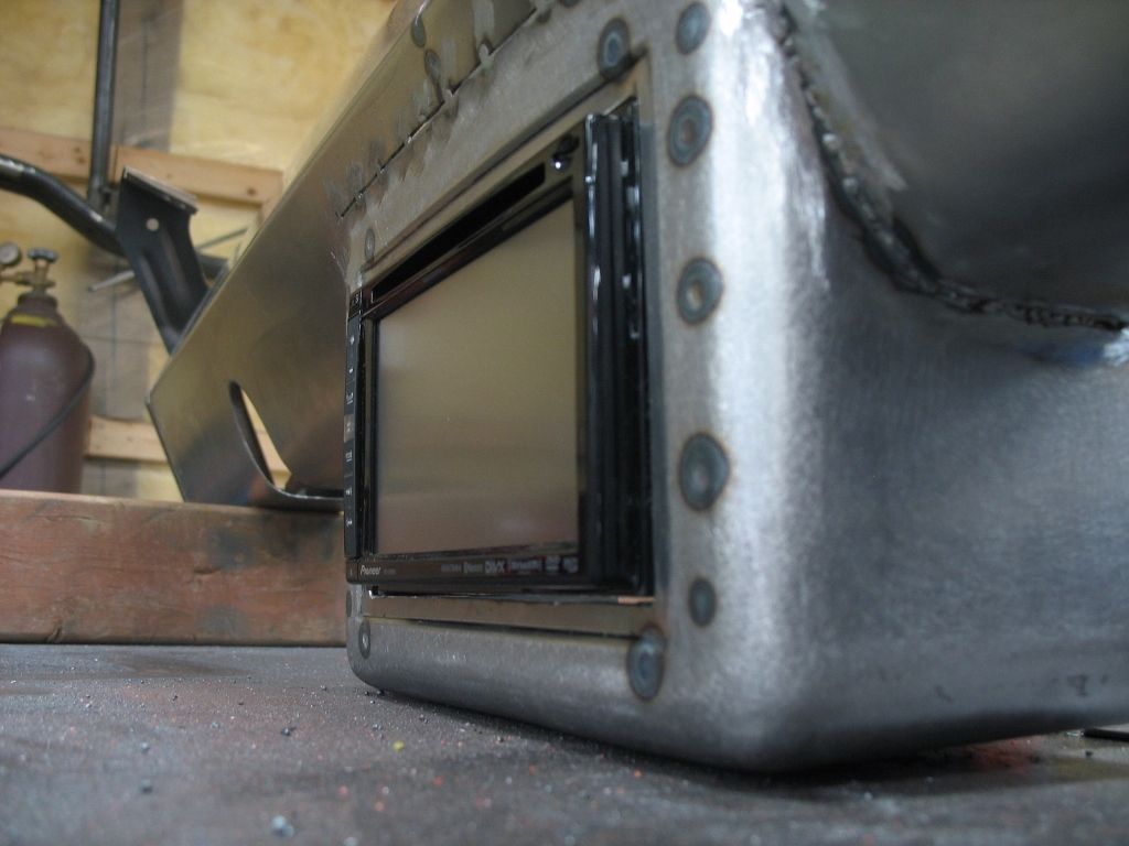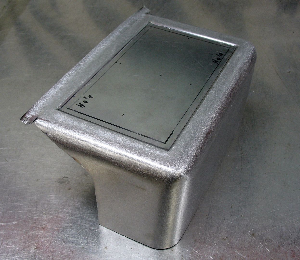 Custom fabricated box that will house the Pioneer double DIN head-unit. Made from two pieces and compound cornered 100% with the Mittler Brothers bead-roller.