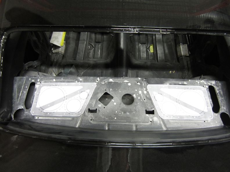 Continuing our theme through the interior we next addressed the rear package shelf. Mock ups for speaket layout were created digitally, test fit and then cut from wood and wrapped or laser cut from sheet metal and powdercoated. We chose Focal speakers for a great sound and they've got a really cool woven texture.