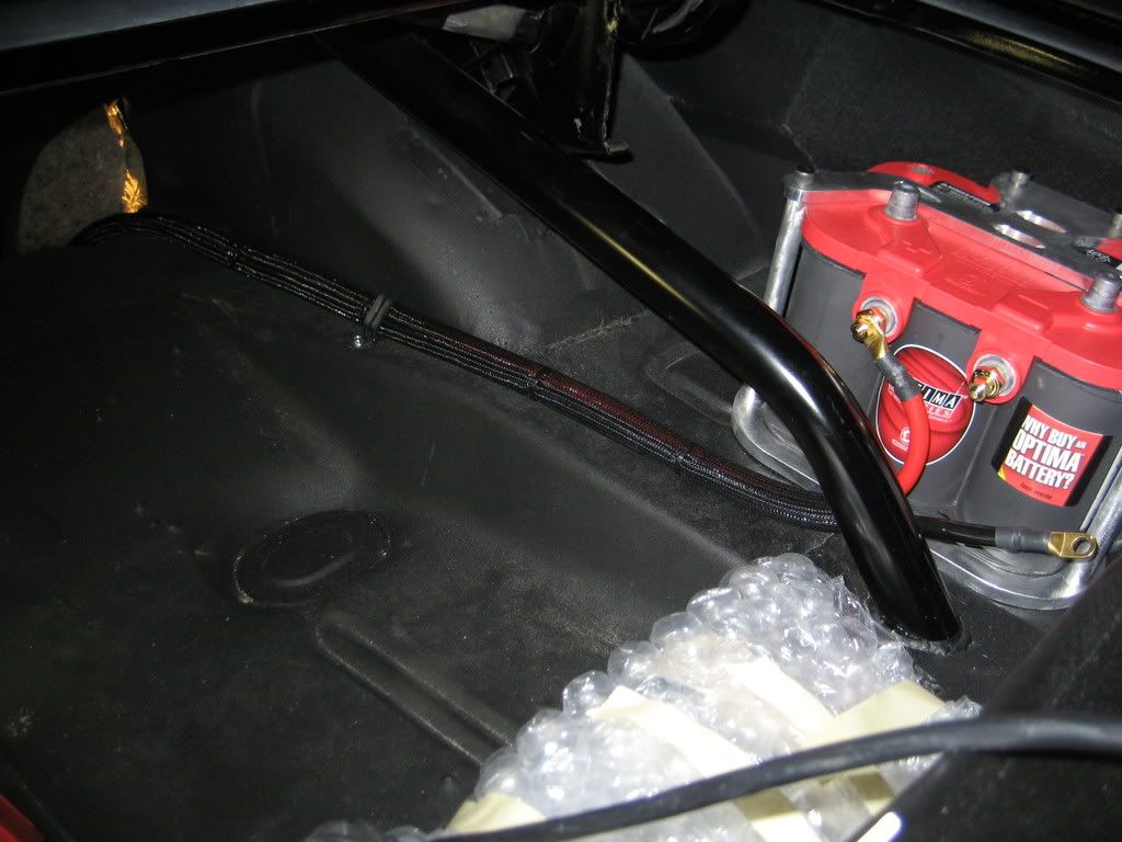 Next I routed my battery cables, soldered the ends, blah blah blah. Old lady helped me with the bulkhead and cross threaded the nut. Good lesson for her. With my seat brackets this is the best way. Negative cable will go through a grommet and ground to the unused bolt at the top of the bellhousing. I was really pissed about the trunk to passenger compartment insulator fit until I had cut on it multiple times and realized my car was mini tubbed. drrrrrrr