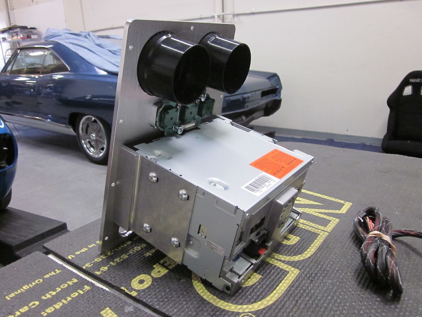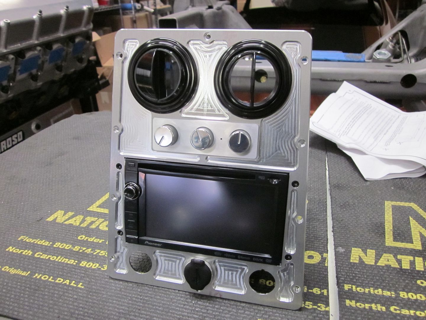The center piece had to change on the dash.. The owner wanted a big face navigation stereo & the other face we fabricated was not working due to it hitting the A/C system.. So we came up with this one.. The billet face plate will be machined next week.. Using USB port & 12 volt out of 2010 Silverado..