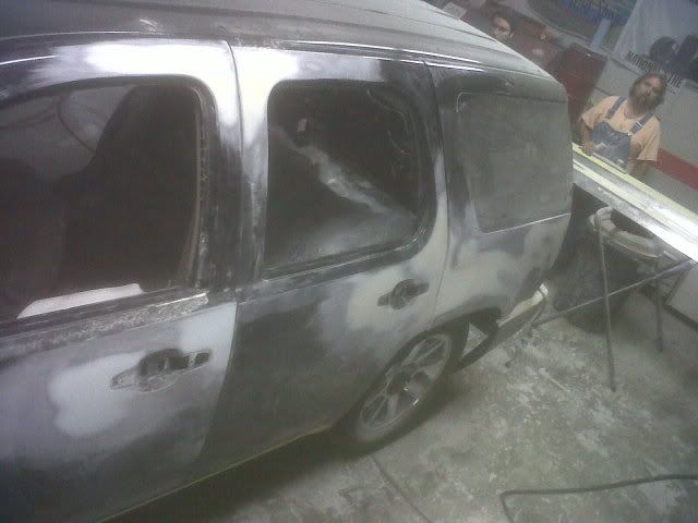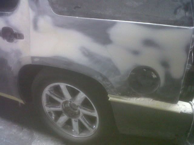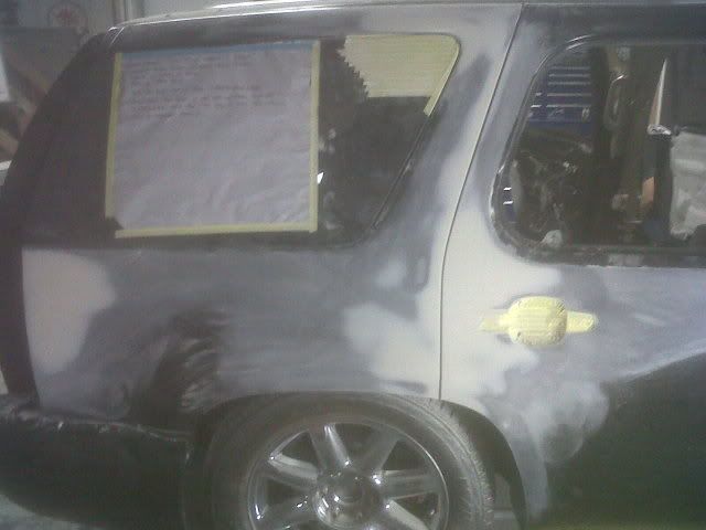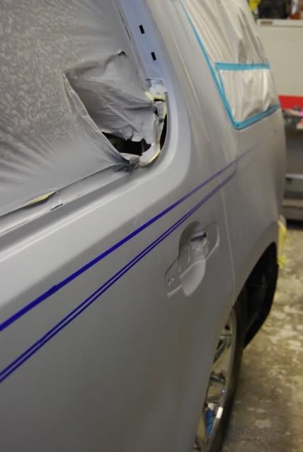 I don't have any pictures of it completed, because, well, it still isn't. The painter we're using does this sort of stuff on the side, so it's taken much longer then we anticipated. The car is mostly painted, it's just getting all of the small pieces and detail areas like insides of doors, door jams, etc. Here's some photos of the work while at the body shop.