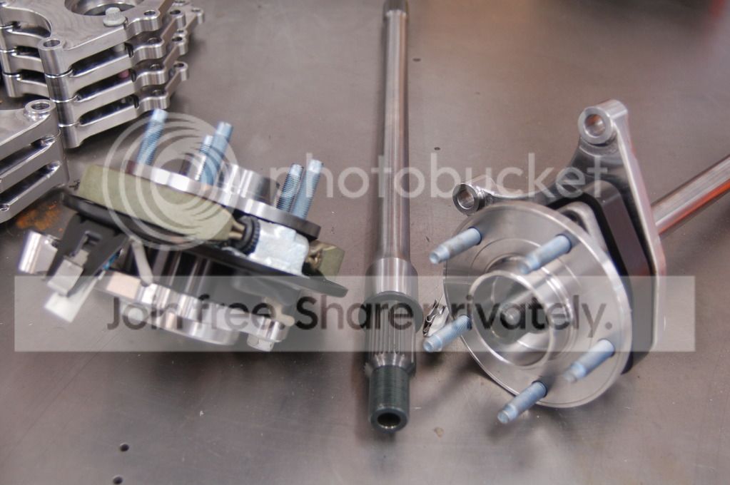http://i439.photobucket.com/albums/q...l/DSC_4298.jpg Note the new gun drilled (weight savings) Strange axles, revised axle end and new spacers. The steel and aluminum spacers were machined by my buddy Ken Tibor. http://i439.photobucket.com/albums/q...l/DSC_3463.jpg http://i439.photobucket.com/albums/q...l/DSC_3877.jpg Because the production ZR-1 SKF bearings are active wheel sensor I had SKF make me the SKF bearing with passive wheel speed sensors to work with the 2007 Delphi ABS module. After a lot of debate with Brembo I chose to use the GTR Calipers over the GT Calipers. We had a lot of discussions like "How much HP? We’ll need to call back to Italy and get back to you" :D So I went with Brembo's recommendation. Those brakes are not for the weak of heart or wallet. Due to my short development time line I don't have time to do a lot of experimentation with the brakes. I have worked with the Brembo guys a bunch on other projects and I think this may be a bit over kill but they will work. I did size the system to work with the Delphi ABS system. The brakes on Red Devil worked very well and I just wanted to tweak the system a little to make it better. With a lot of due care you can get ABS to work on an old hot rod. You just need to keep it happy with the correct sensors to make it work. I want to keep my ABS set up my competitive advantage for a while. Bosch does sell an aftermarket ABS system that is laptop programmable. So it is accessible technology to anyone with the budget or time to sort it out. I look at ABS, Stability Control and Performance Traction Management as the next thing for the aftermarket to crack into. Like EFI was 25 years ago only a few people could do it and few aftermarket company’s make systems and they were expensive. Now EFI is main stream and very easy to do. So I see chassis controls going that way in a few years. Hey if it was easy everyone would be doing it.... If I can get the car out of paint jail I can start putting it together. (Paul and Joe are doing a great job) You can’t rush this quality of a paint job. Mark |