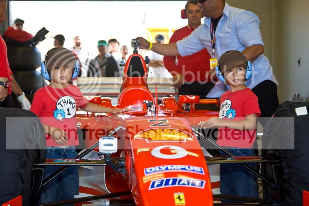 Here is a pic of my friend's twin boys taken earlier this year at Laguna Seca Raceway. While the public was not allowed in the paddock, the boys were invited in! The car is Rubens Barrichello's 2003 Ferrari.
