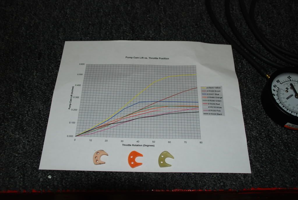 OK, I lied. I played a little today. I wasn't thrilled with the RPM matching capabilities of the carb. The primary squirter was lean and it was very difficult to make a a good downshift. I found this chart that graphs all the different accelerator pump cams. The carb came with the pink cam and I never changed it. I had played with squirters multiple times over the past couple years. I decided to step up to the blue cam which brings on the fuel much faster than the pink cam. It made sense with the rpm match scenario. It's a quick pop of the throttle on a down shift that likely doesn't see more than half throttle. It was pretty good cold but got a little fat as the engine came up to temp. I decided to drop the squirter from a 40 to a 35 and I can now rpm match pretty damn good.