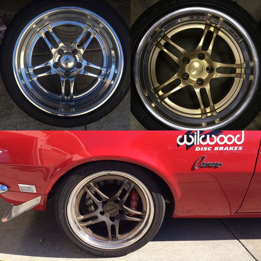 As I mentioned I've now painted the wheel centers gold. I used Plastidip vintage gold with gold metalizer which is temporary and supposed to be easily removed as long as you apply it thick enough. The one issue is that gold metalizer uses the Plasti dip glossifier with gold metal flakes and glossifier leaves a more noticeably rubbery finish rather than smooth. This stuff is a magnet for brake dust. Like crazy bad. It comes off but requires some elbow grease and I've read that if you leave it on it will stain the dip. First pic shows the before, after painting, and after a track day at Laguna Seca. http://i1380.photobucket.com/albums/...psuuvfptvn.jpg Here is a shot of them on the car with about 500 miles of driving on them. http://i1380.photobucket.com/albums/...psfrxrgfhz.jpg |