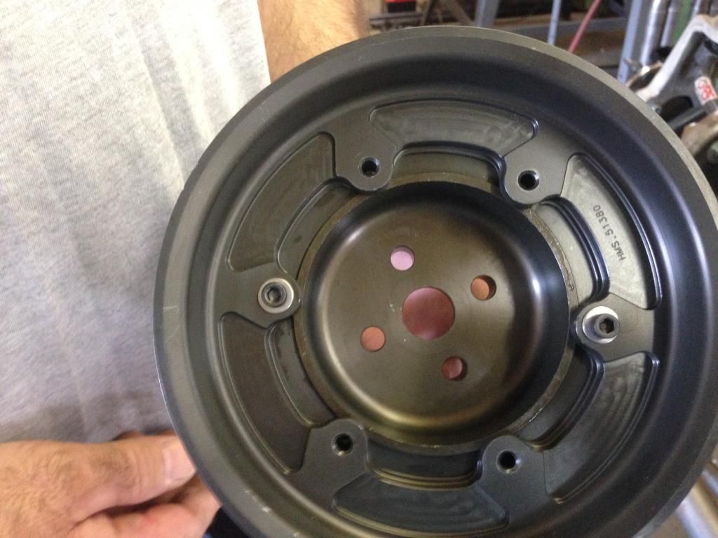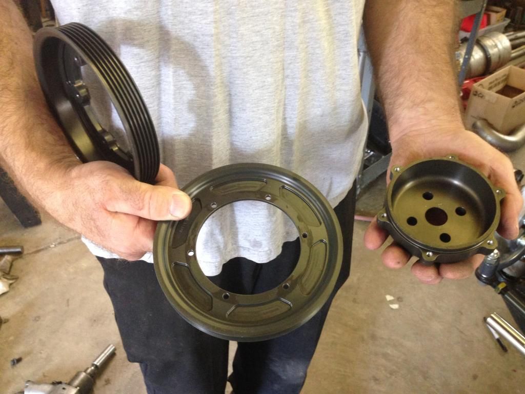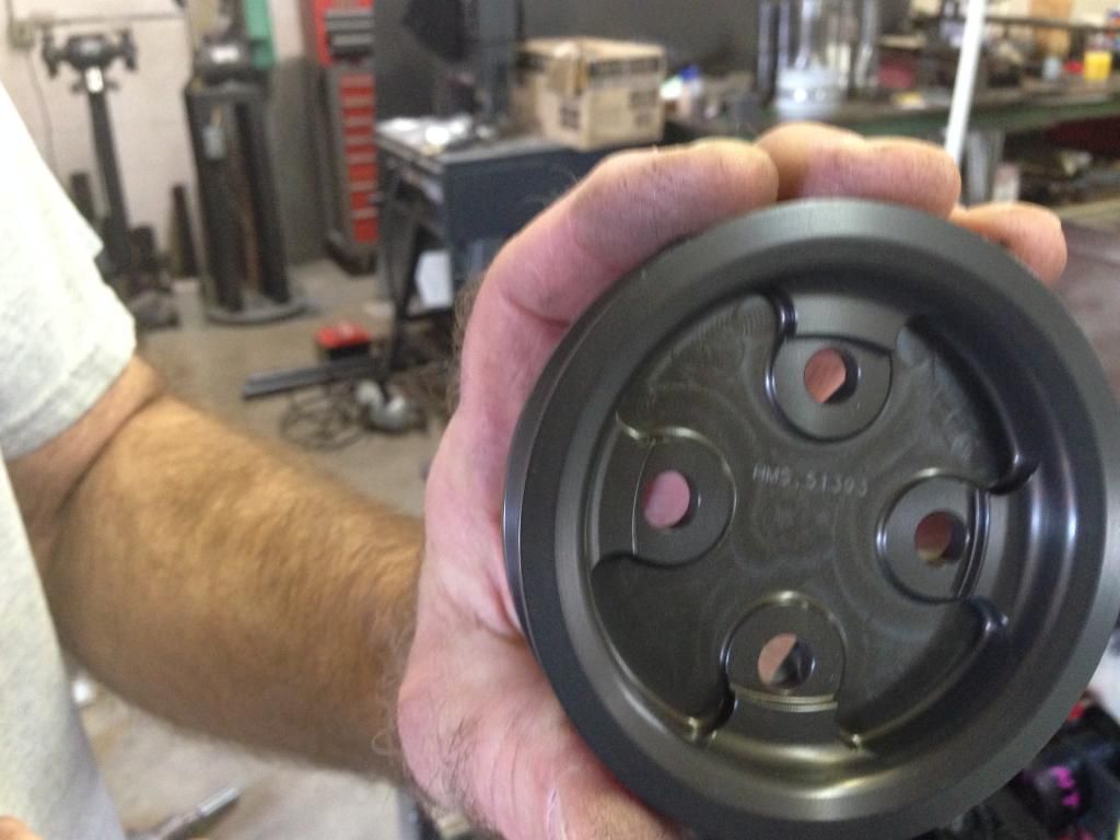 Here is something you do not see everyday. These are pulleys that Hendrick machines up for their motors. They are modular and they make them in different diameters to change the pulley ratios for different tracks and RPM ranges.