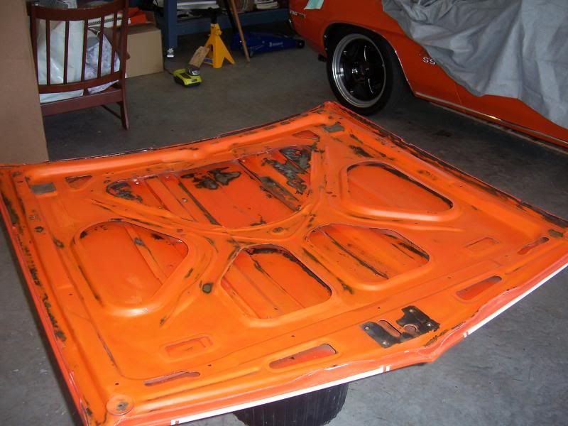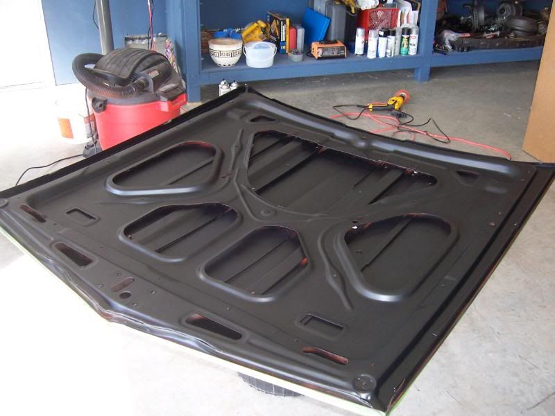 I finally got some more under hood details sorted out that had been bothering me for awhile. I pulled the hood off and did the underside back to the factory semi-gloss black. The orange was peeling in a few spots and it needed to be cleaned up.