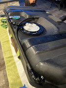 Some possible things to check. Vented cap? Some of Ricks newer tanks have the new style screw caps that I believe are non-vented. I had to try a few reg. vented caps until one that worked properly. The vent line in your pic looks to be tucked under the fuel feed line, I would get it up high as quickly as possible, maybe you did? Maybe you over filled the tank and the trigger didn't get activated to stop soon enough. I try not to over fill and listen as I fill up. The hoses going to the vent canister are in the right ports? Gas coming from the in ground gas station tanks is cooler then pumped into vehicle gas tank will expand somewhat. I added another tank vent boss on my filler tube at around the 1-2:00 position to help with the venting, hoping it helps and no issues so far. |