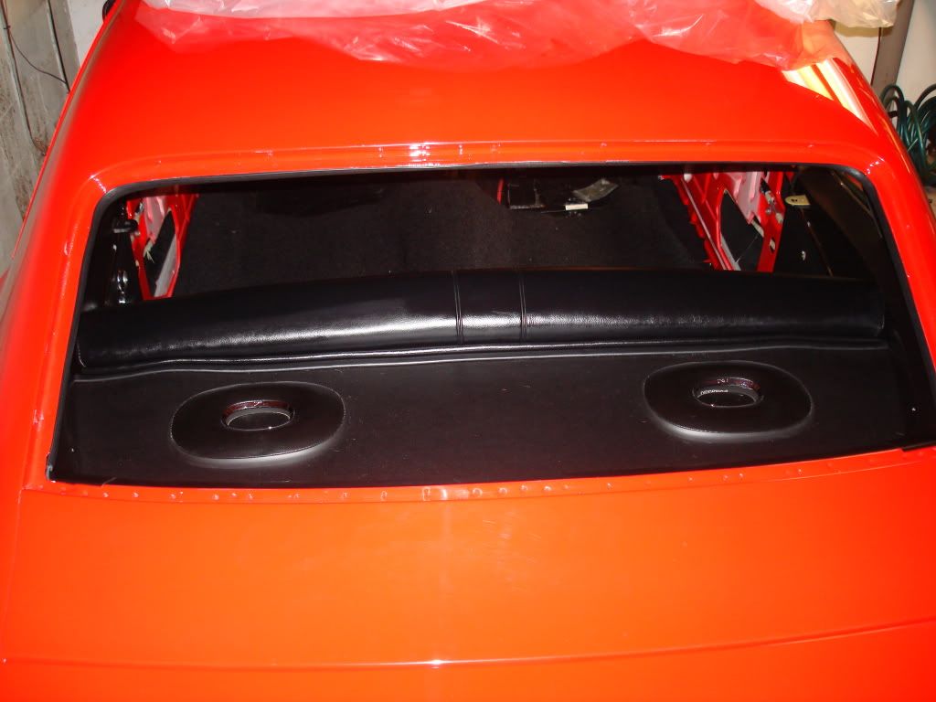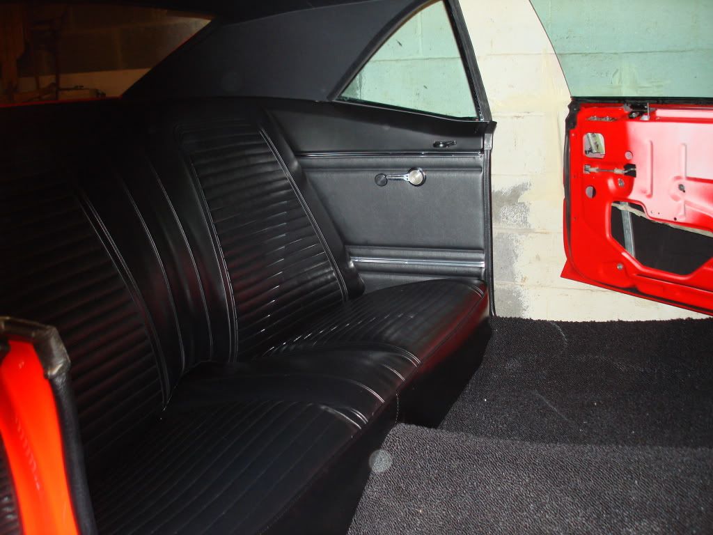 Door and quarter window glass is always fun, lots of adjustments, I got it pretty well adjusted, it certainly doesn't fit like the original but it does look nice on a new build. Working from the top down and back to front. So the rear deck and rear seat and door panels are in. Because of the harness bar tab coming through the belt line, I thought it would be a good idea to use a 67 door panel. This way I didn't have to buy/cut in to the 69 rear panels and try to trim it out, we finish painted the belt line all the way around for this reason. A couple of Polk 6x9 speakers in the rear deck and getting ready to trim carpet.