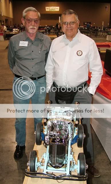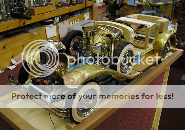 This is very cool. Be sure to check out the video on YouTube of the engine running. A Duesenberg in Miniature by Louis Chenot http://i886.photobucket.com/albums/a...nbergModel.jpg No, it's not a real full-size Duesenberg, but rather a beautifully constructed working model about 35" long made in 1/6 scale. Louis Chenot has spent the past ten years building this incredibly detailed 1932 SJ Duesenberg LaGrande dual-cowl phaeton. Not only does it look good, but the engine runs, the lights work, the top mechanism functions and the transmission and driveline are complete. Lou started his research on this project over fifty years ago with the purchase of a book and over the years collected many drawings and studied a number of Duesenbergs while they were being restored, taking photos and recording dimensions. The model weighs about 60 pounds. Lou's 40 year career was spent as a mechanical engineer. He once restored a vintage 1930 Cadillac convertible that was on the show circuit for years, but now he prefers to work in miniature in the comfort of his home shop. http://i886.photobucket.com/albums/a...bergModel2.jpg The bodywork is all metal, not fiberglass. Here is the car in Lou's shop before the brass coachwork was primed or painted. Lou is not adverse to starting over on a part that doesn't meet his standards. He started over on the especially difficult brass radiator shell nine times. Most running models are built at larger scales like 1/3 or 1/4. Working in the smaller 1/6 scale magnifies the problems caused by miniaturizing certain parts. Remember that scale parts are 1/6 as long, 1/6 as high and 1/6 as deep as real parts, making them 1/6 x 1/6 x 1/6 or 1/216th of the volume of the original part. Further complicating the prospect of building a running engine at that size is the fact that fuel molecules and electricity don't scale. It is very difficult to get tiny carburetors and little spark plugs to work like the big ones. A video of Lou starting and running the engine for the first time can be seen at https://www.youtube.com/watch?v=f6TetkMpFIc . http://i886.photobucket.com/albums/a...odelEngine.jpg Inside the straight eight engine are all the correct parts custom machined to scale from steel, cast iron and aluminum. Here we see the block and crankshaft at the top. Arrayed below the block are the cast iron cylinder sleeves, pistons, wrist pins and assembled connecting rods. http://i886.photobucket.com/albums/a...linderHead.jpg Even though there would be no way to tell once it is all assembled, the cylinder head shows that Lou didn't cheat. The engine has 4 valves per cylinder--32 total--just like the real thing. http://i886.photobucket.com/albums/a...inderHead2.jpg Here is the head (before painting) with the camshafts in place--there are 16 lobes on each shaft. (The apparent curve of the upper shaft is caused by the camera's wide angle lens.) The gears inside the differential will never be seen by anyone, but Lou cut them as actual hypoid gears rather than machining simpler bevel gears. http://i886.photobucket.com/albums/a...RearAxle-1.jpg This is the dashboard and interior with the body primed but not yet painted. http://i886.photobucket.com/albums/a...rgInterior.jpg Note the detailed instruments and engine-turned finish on the dash. The complicated convertible top mechanism is shown in the lowered position. http://i886.photobucket.com/albums/a...senbergTop.jpg Louis Chenot (Left) and Joe Martin (Right) inspect progress on the chassis and engine at the NAMES show in Detroit in 2007. http://i886.photobucket.com/albums/a...rgDesigner.jpg Lou was presented with a special Lifetime Achievement award by the Joe Martin Foundation for Exceptional Craftsmanship in 2009. The model was nearing completion but the engine had not yet run. Now that the engine runs and the model is completed, Lou has been selected as the foundation's "Metalworking Craftsman of the Year." The award includes an engraved award medallion and a check for $2000.00. Lou is the 15th person to receive this coveted annual award. Because it is likely that this could well be the finest running model car ever built in this small a scale, Lou's award this year will be presented as the "Craftsman of the Decade." http://i886.photobucket.com/albums/a...ModelAward.jpg More can be seen on this car and some of Lou's other projects at www.CraftsmanshipMuseum.com/Chenot.htm. The model will be on public display in 2011 at the Cabin Fever Model Expo in York , PA in January and at the North American Model Engineering Society Expo in Southgate , MI in April where Lou will be officially presented with his award. It will also be on display at the Western Engine Model Exhibition to be held in conjunction with the Good Guys car show in Pleasanton , CA in August, 2011. This message was produced by the Joe Martin Foundation. Please feel free to forward it to anyone you know who likes fine craftsmanship, car models, miniature engines and/or Duesenbergs. See the outstanding work of Lou and 99 other world-class craftsmen at www.CraftsmanshipMuseum.com. |