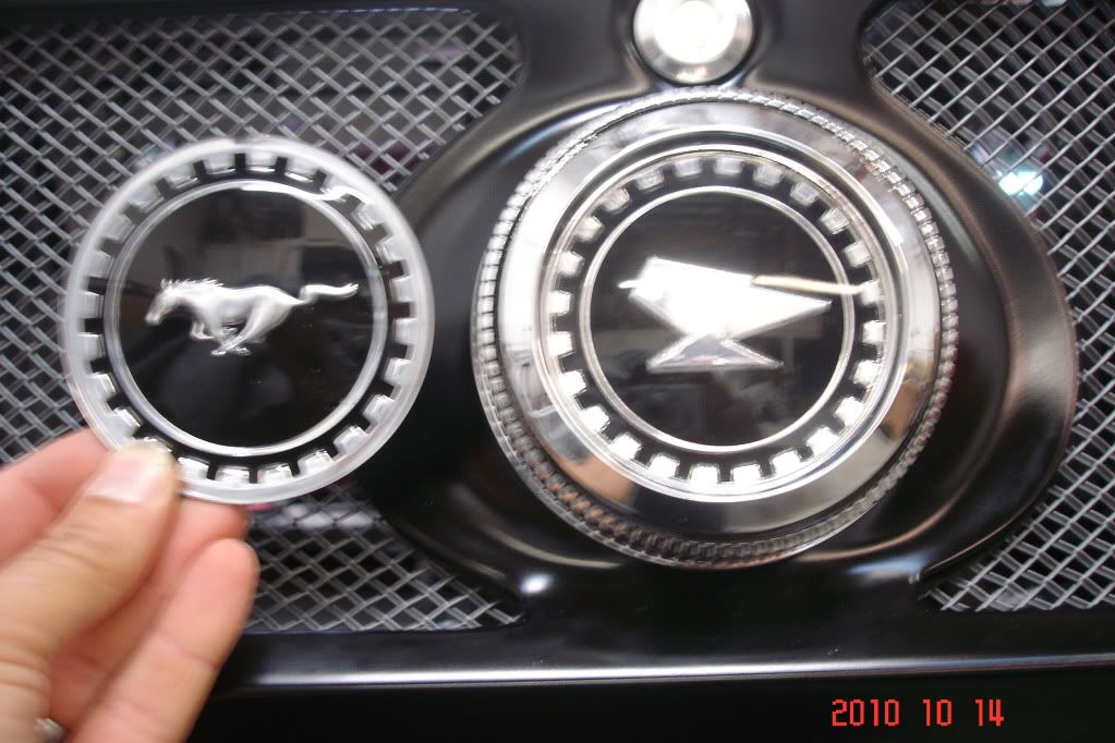 Here are a couple details that make it the "Anvil" Mustang. We remade the gas cap center piece in Solidworks and made the middle part with the Anvil icon instead of the running horse, then had it CNC'd out of polycarbonate. We did the same for the horn button only smaller and without the border detail.