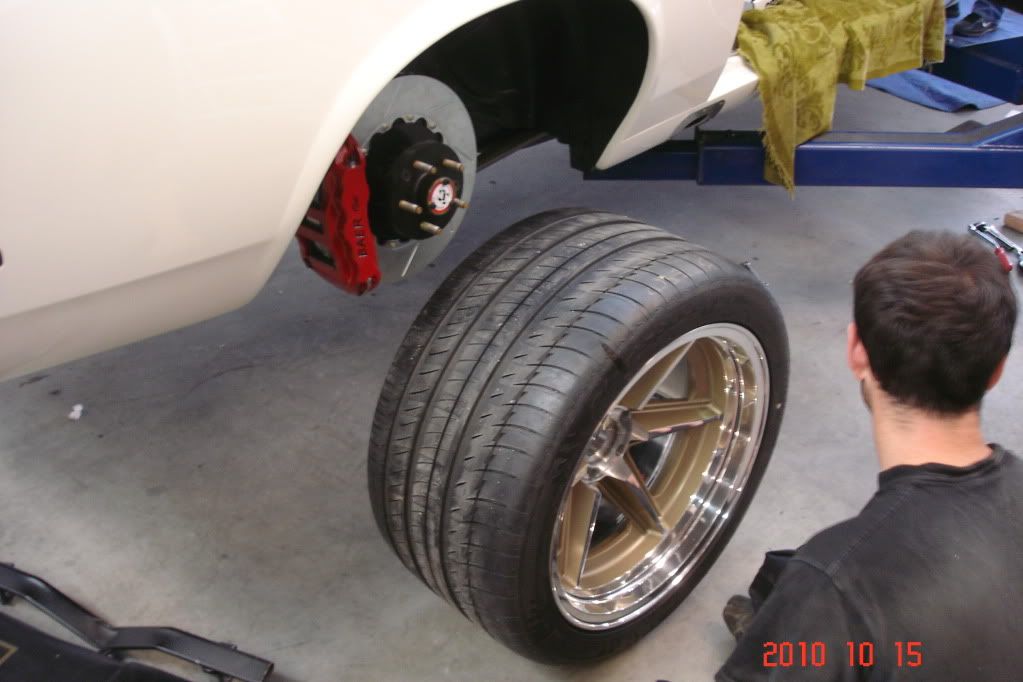 Here the 345s are being fit to the rear axle. The widened quarters and agressive wheels and tires might be the sexiest thing on this car.