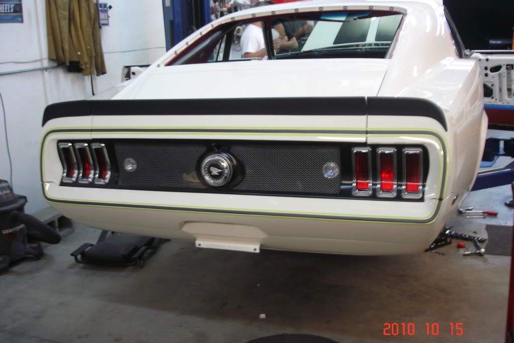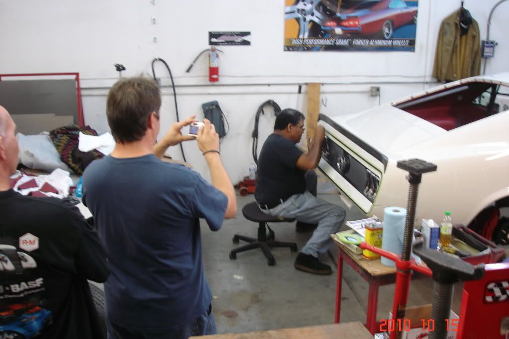Here's the one and only Steve Stanford doing the pinstriping on the edge of the rear stripe. http://i219.photobucket.com/albums/c...g/Oct15052.jpg Here's the rear end taped off for pinstriping, but otherwise done except for the rear glass. Luckily NPD in Ventura was open until 9 PM on Friday or we wouldn't have had rear glass for the mansion. The glass guy didn't realize that his supplier gave him the wrong back glass until about 5:30 Friday night! Yikes! NPD had it in stock, so he went and picked it up. http://i219.photobucket.com/albums/c...g/Oct15051.jpg |