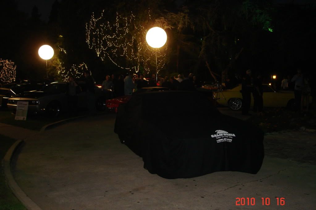 Here's the car at the mansion waiting to be unveiled. The cover is comliments of California Car Cover who made a custom car cover without the elastic on the bottom for unveiling the car. You can see Charley's Jackass in the background (somehow that doesn't read quite right).