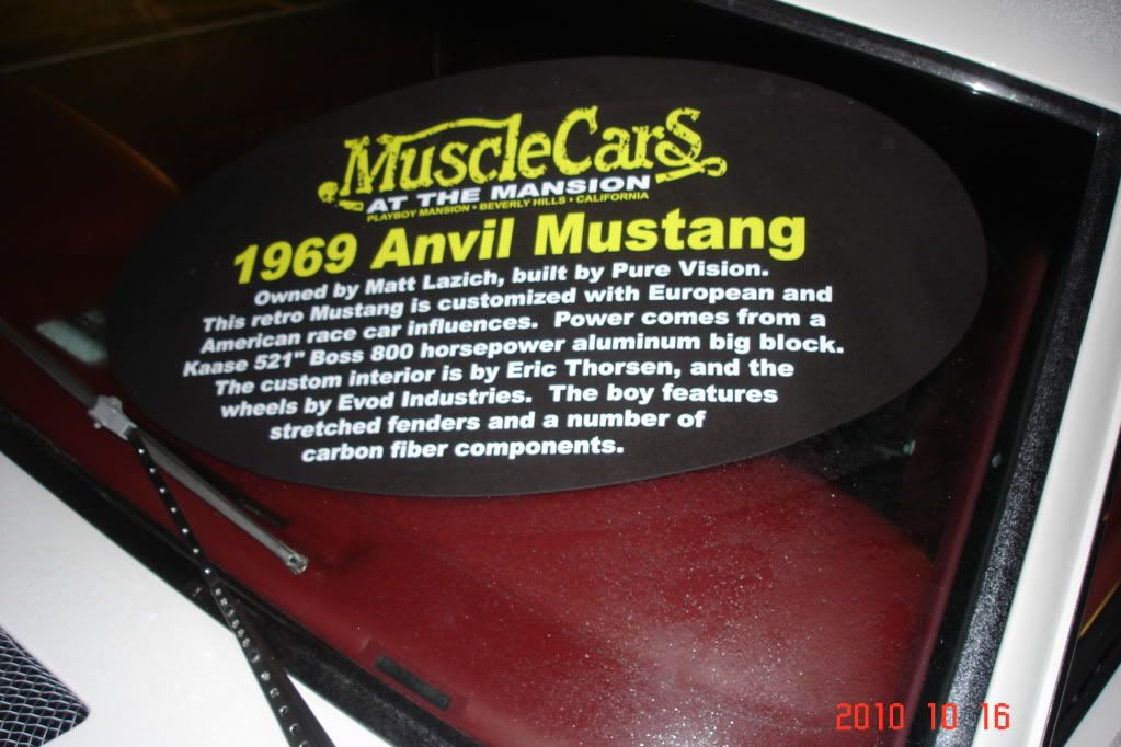Here's a shot of the windshield sign at the mansion http://i219.photobucket.com/albums/c...Playboy018.jpg Here's me and my better half (who needs Playboy chicks?) standing in front of the unveiled Mustang at the Playboy mansion. You can see some of the car in the background (to prove it was there and complete). http://i219.photobucket.com/albums/c...Playboy027.jpg |