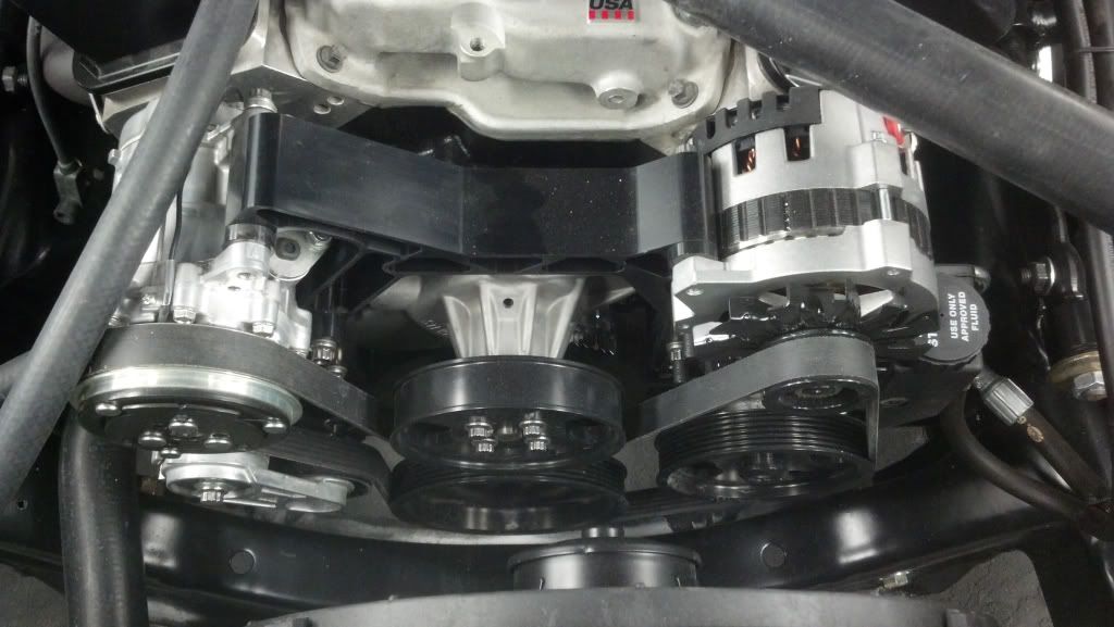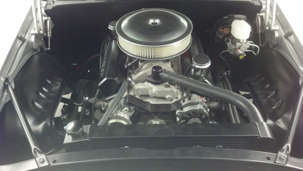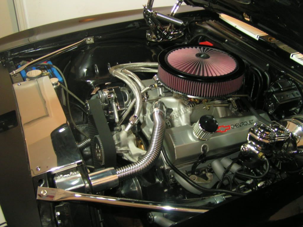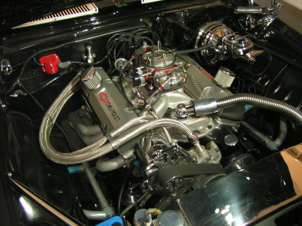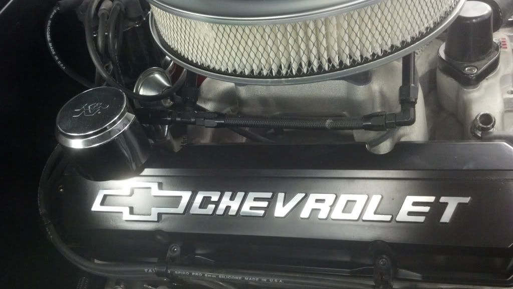 Here is what it looked like when I bought her http://i855.photobucket.com/albums/a...lcars-02-1.jpg Not the prettiest but got the job done. I actually liked the belt drive. It was different. Here is the 383 that will remain once we are done. I cleaned things up and made it more my own. http://i855.photobucket.com/albums/a...PICT0008-1.jpg http://i855.photobucket.com/albums/a...PICT0010-1.jpg Very functional, dynoed at 470 hp and 515 ft lbs tq. As with many things, taste change and I decided to get rid of all the shiny bling bling. Here are a couple crappy cell phone pics. Going for the clean sanitary look hiding as much as possible. Less chrome, more black. I'll tell you what, we had to preform major surgery on the Doug's headers to get them to clear the Tru-Turn set up. I'll post more on that once I get her back and can take more pics. http://i855.photobucket.com/albums/a...ps31280cb4.jpg I stole this ides from Todd (Vegas69) on hiding the coil on the back of the manifold. http://i855.photobucket.com/albums/a...ps06348d3d.jpg Even ran the fuel line up the back of the block with the fuel regulator mounted to the back of the head so no holed in the smoothed firewall. http://i855.photobucket.com/albums/a...psedc5f01e.jpg Vintage Air front runner. Went through 3 hardline adapters to get the one I wanted which dives down between the compressor and head. It isn't on yet in this pic. http://i855.photobucket.com/albums/a...ps3d283328.jpg As mentioned yesterday, we just got the manifold back from being powder coated yesterday. The black block & manifold with the aluminum heads look killer together. Everything will be black and brushed. The chrome breathers gotta go. |