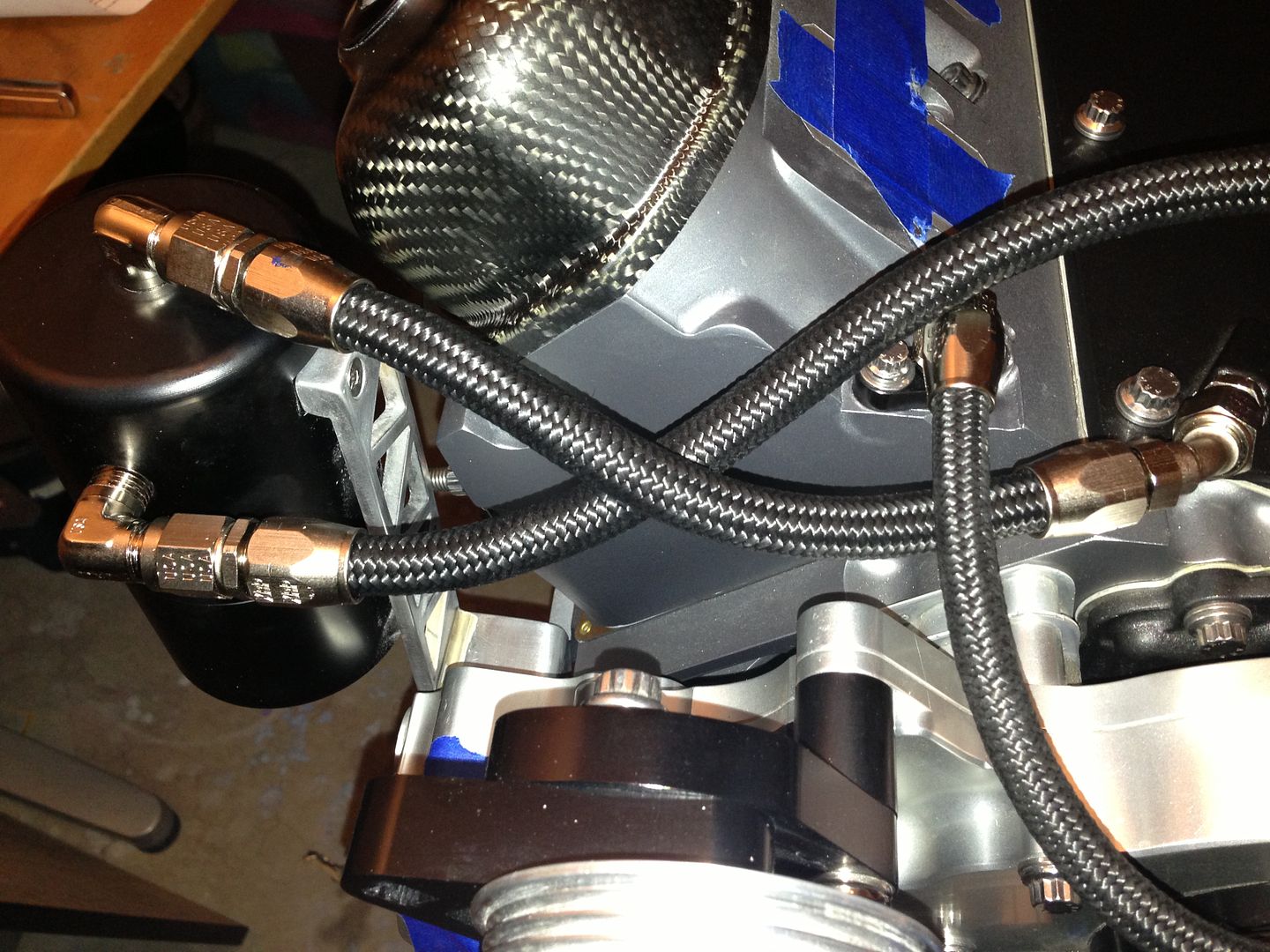 This was pretty cool. Instead of using a clamp to hold the vacuum line, the boys removed factory press in tube and replace it with a AN fitting. http://i1231.photobucket.com/albums/...ps5c33d582.jpg 1/8 NPT thread was taped. http://i1231.photobucket.com/albums/...ps08870502.jpg A lot nice and mechanical look. http://i1231.photobucket.com/albums/...ps8f3dee52.jpg Random pics but I thought I'd post it as it's looks so clean! http://i1231.photobucket.com/albums/...psb2ed0c6e.jpg http://i1231.photobucket.com/albums/...psb470cb4d.jpg A lot of work went into making the bracket for the catch can. The spacer was welded to the bracket for a clean look. http://i1231.photobucket.com/albums/...pse1d96a3a.jpg You can see a better view of the bracket in this pic. Now it just need to get powder coated. http://i1231.photobucket.com/albums/...psb44b6326.jpg In the next three pics you can see how the PVC line was completely rerouted to the back of the engine. http://i1231.photobucket.com/albums/...ps5b68b197.jpg http://i1231.photobucket.com/albums/...psc341348f.jpg http://i1231.photobucket.com/albums/...psd440c72a.jpg |